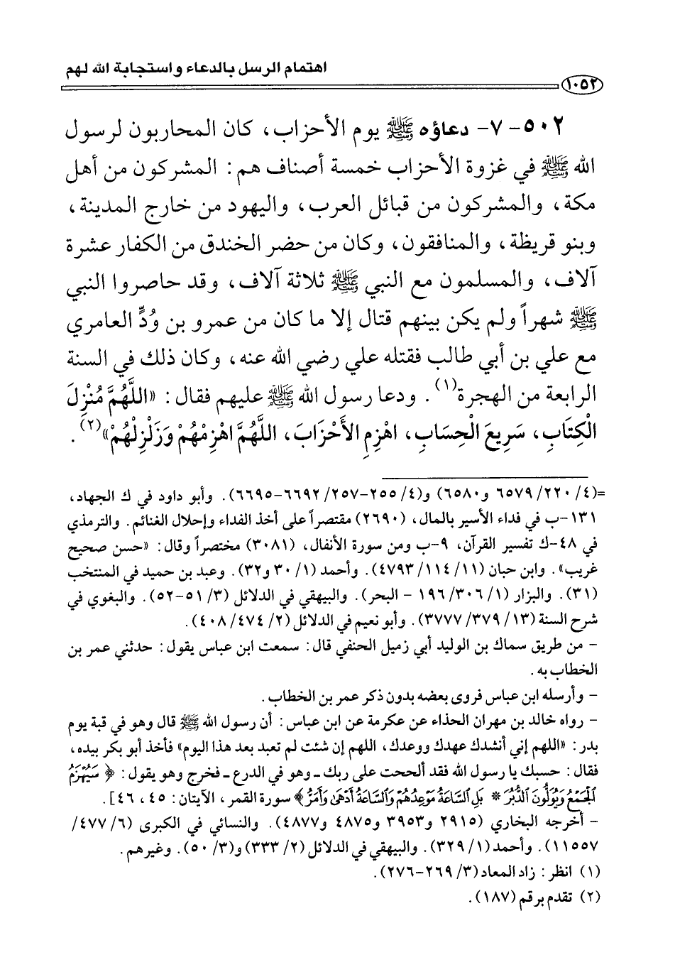 ٥٠٢ - ٧ - دعاؤه صلى الله عليه وسلم يوم الأحزاب، كَانَ المحاربون لرسول الله صلى الله عليه وسلم فِي غزوة الأحزاب خمسة أصناف هم: المشركون من أَهْلِ مكة، والمشركون من قبائل العرب، واليهود من خارج المدينة، وبنو قريظة، والمنافقون، وكَانَ من حضر الخندق من الكفار عشرة آلاف، والمسلمون مَعَ النبي صلى الله عليه وسلم ثلاثة آلاف، وَقَدْ حاصروا النبي صلى الله عليه وسلم شهرًا وَلَمْ يكن بينهم قتال إلا مَا كَانَ من عمرو بن ود العامري مَعَ علي بن أَبِي طالب فقتله علي رضي الله عنه، وكَانَ ذَلِكَ فِي السنة الرابعة من الهجرة (¬١). ودعا رسول الله صلى الله عليه وسلم عليهم فقَالَ: «اللَّهُمَّ مُنْزِلَ الْكِتَابِ، سَرِيعَ الْحِسَابِ، اهْزِمِ الأَحْزَابَ، اللَّهُمَّ اهْزِمْهُمْ وَزَلْزِلْهُمْ» (¬٢).