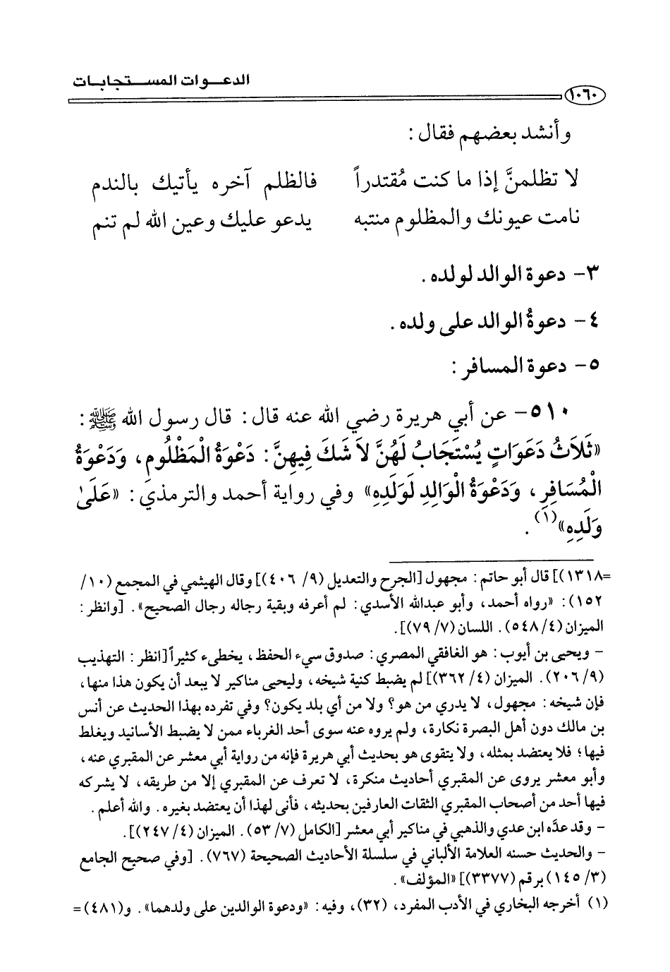 ٥١٠ - عن أبى هريرة رضي الله عنه قَالَ: قَالَ رسول الله صلى الله عليه وسلم: «ثَلَاثُ دَعَوَاتٍ يُسْتَجَابُ لَهُنَّ لَا شَكَ فِيهِنَّ: دَعْوَةُ الْمَظْلُومِ، وَدَعْوَةُ الْمُسَافِرِ، وَدَعْوَةُ الْوَالِدِ لَوَلَدِهِ «. وفي رواية أحمد والترمزي: «عَلَى وَلَدِهِ «(¬١).