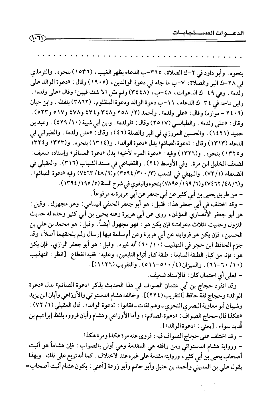 = بنحو». وأبو داود في ٢ - ك الصلاة، ٣٦٥ - ب الدعاء بظهر الغيب، (١٥٣٦) بنحوه. والترمذي في ٢٨ - ك البر والصلاة، ٧ - ب ما جاء في دعوة الوالدين، (١٩٠٥) وقال: «دعوة الوالد على ولده». وفي ٤٩ - ك الدعوات، ٤٨ - ب، (٣٤٤٨) وَلَمْ يقل» لاشك فيهن» وقال» على ولده». وابن ماجه في ٣٤ - ك الدعاء، ١١ - ب دعوة الوالد ودعوة المظلوم، (٣٨٦٢) بلفظه. وابن حبان (٢٤٠٦ - موارد) وقال: «على ولده». وأحمد (٢/ ٢٥٨ و ٣٤٨ و ٤٣٤ و ٤٧٨ و ٥١٧ و ٥٢٣). وقال: «على ولده». والطيالسي (٢٥١٧) وقال: «لولده». والطبراني في الدعاء (١٣١٣) وقال: «دعوة الصائم» بدل» دعوة الوالد». و (١٣١٤) بنحوه. و (١٣٢٣ و ١٤٢٣ و ١٣٢٥) بنحوه. و (١٣٢٦) وفيه: «دعوة المرء لأخيه» بدل» دعوة المسافر» وإسناده ضعيف: لضعف الخليل ابن مرة. وفي الأوسط (٢٤). والقضاعي في مسند الشهاب (٣١٦). والعقياي في الضعفاء (١/ ٧٢). والبهقي في الشعب (٣/ ٣٠٠/ ٣٥٩٤) و (٦/ ٤٨/ ٧٤٦٣) وفيه» دعوة الصائم». و (٦/ ٤٨/ ٧٤٦٢) و (٦/ ١٩٩/ ٧٨٩٥) بنحوه والبغوي في شرح السنة (٥/ ١٩٥/ ١٣٩٤).