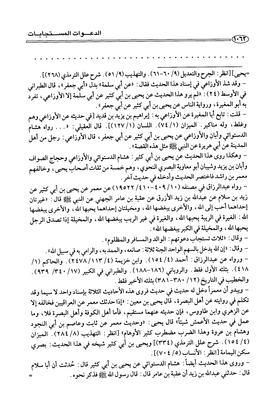 - وهكذا روى هذا الحديث عن يحيى بن أبي كثير: هشام الدستوائي والأوزاعي وحجاج الصواف وأبان بن يزيد وشيبان أبو معاوية البصري النحوي، وهم خمسة من ثقات أصحاب يحيى، وخالفهم معمر بن راشد فاختصر الحديث وأدخله في حديث آخر.