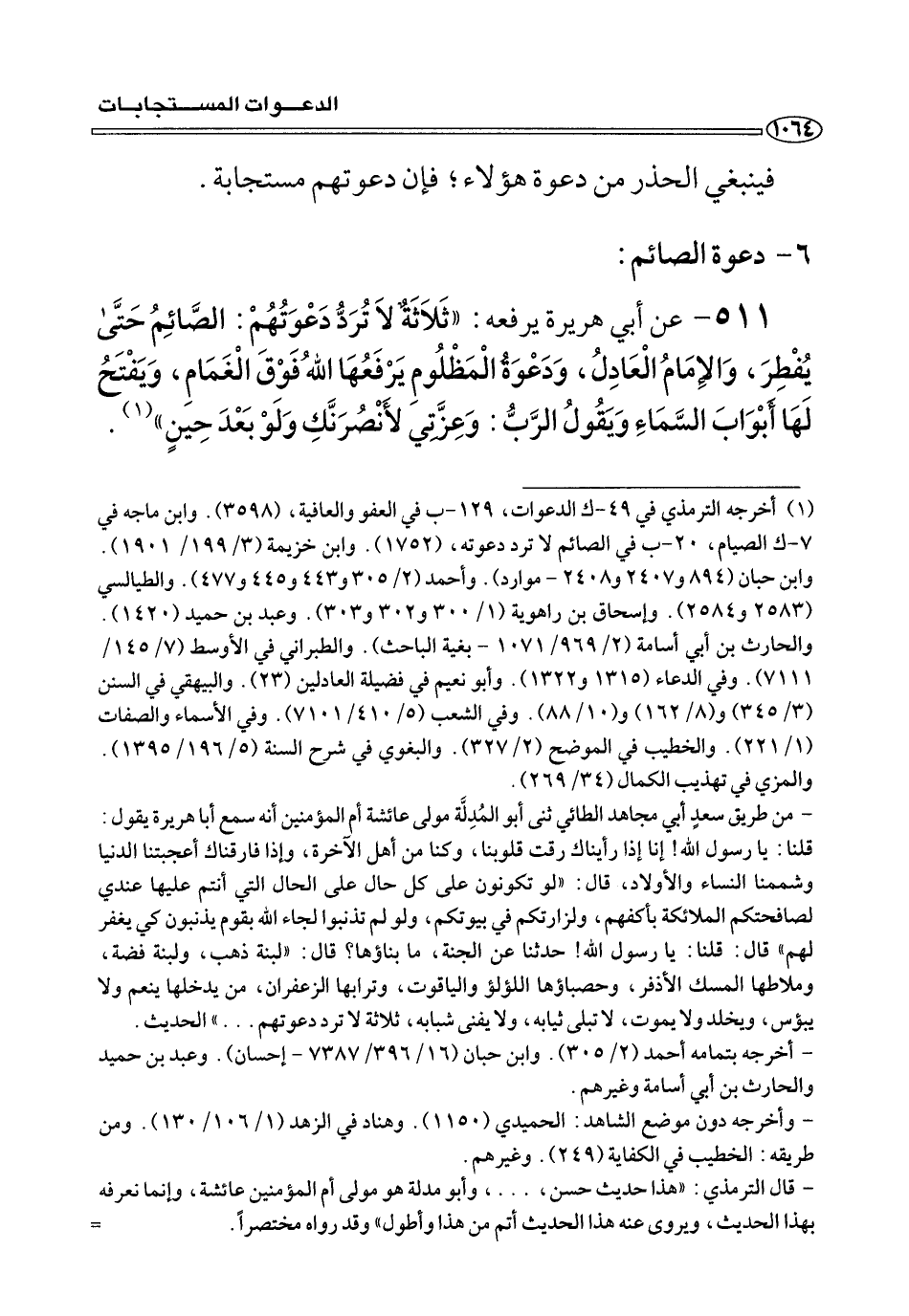 ٥١١ - عن أَبِي هريرة يرفعه: «ثَلَاثَةٌ لَا تُرَدُّ دَعْوَتُهُمْ: الصَّائِمُ حَتَّى يُفْطِرَ، وَالإِمَامُ الْعَادِلُ، وَدَعْوَةُ الْمَظْلُومِ يَرْفَعُهَا اللهُ فَوْقَ الْغَمَام، وَيَفْتَحُ لَهَا أَبْوَابَ السَّمَاءِ وَيَقُولُ الرَّبُّ: وَعِزَّتِي لأَنْصُرَنَّكِ وَلَوْ بَعْدَ حِينٍ» (¬١).