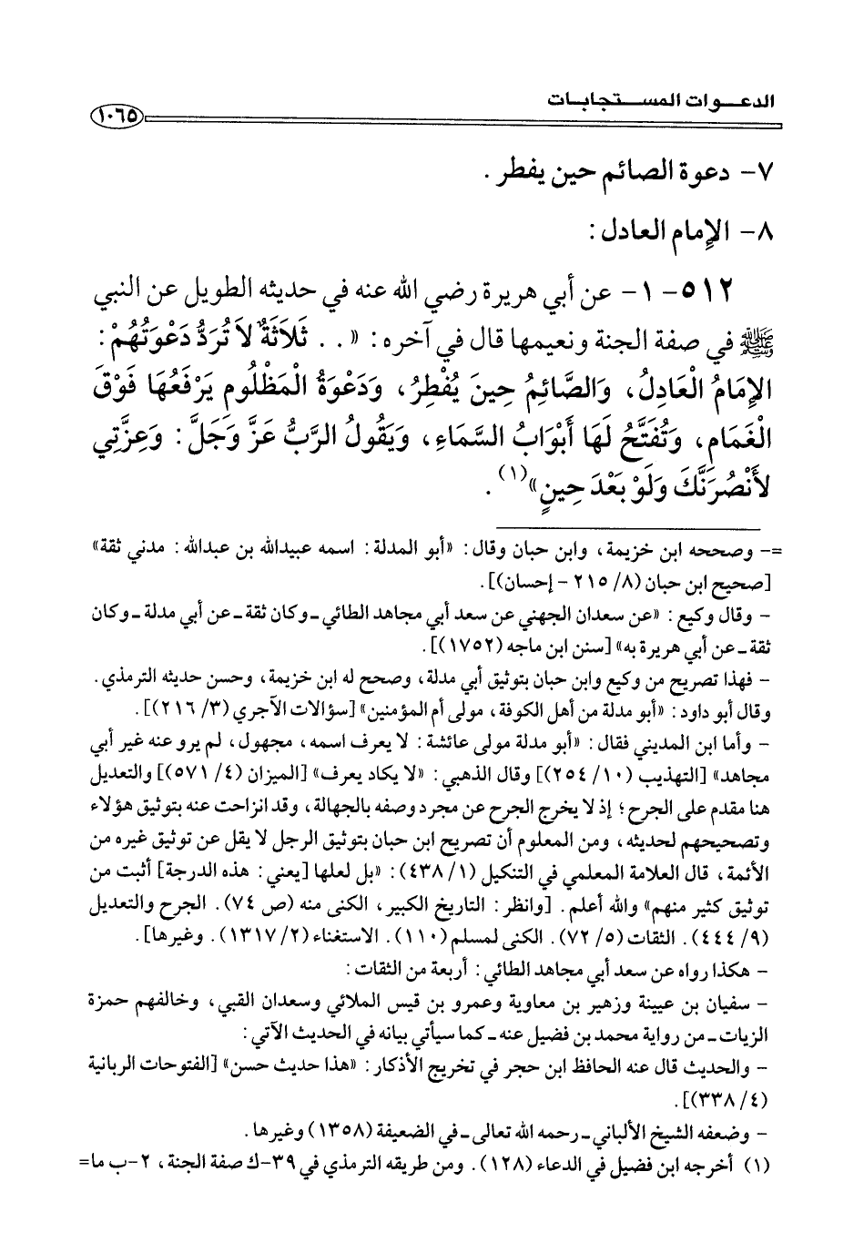 ٥١٢ - ١ - عن أَبِي هريرة رضي الله عنه في حديثه الطويل عن النبي صلى الله عليه وسلم في صفة الْجَنَّةِ ونعيمها قَالَ في آخر: « .. ثَلَاثَةٌ لَا تُرَدُّ دَعْوَتُهُمْ: الإِمَامُ الْعَادِلُ، وَالصَّائِمُ حِينَ يُفْطِرُ، وَدَعْوَةُ الْمَظْلُومِ يَرْفَعُهَا فَوْقَ الْغَمَامِ، وَتُفَتَّحُ لَهَا أَبْوَابُ السَّمَاءِ، وَيَقُولَ الرَّبُّ عَزَّ وَجَلَّ: وَعِزَّتِي لأَنْصُرَنَّكَ وَلَوْ بَعْدَ حِينٍ» (¬١).