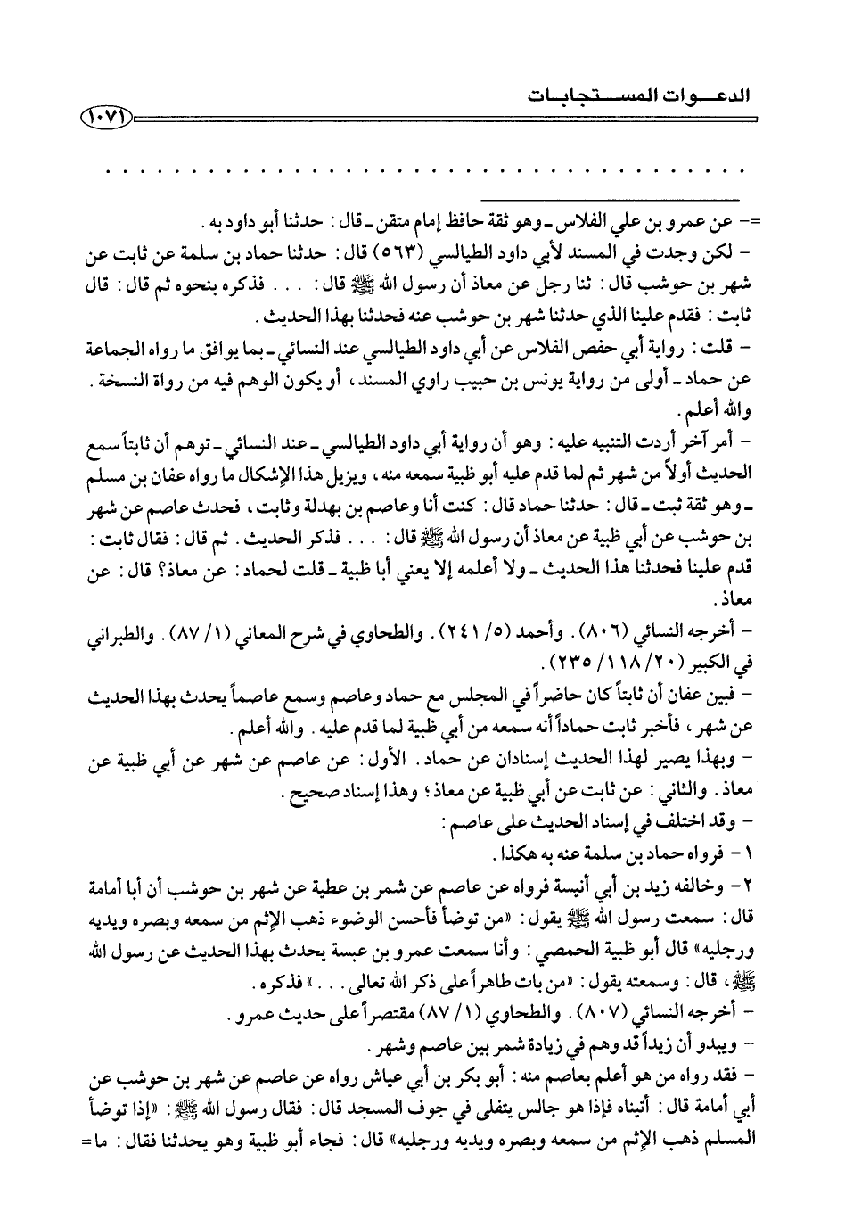 - وبهذا يصير لهذا الحديث إسنادان عن حماد. الأول: عن عاصم عن شهر عن أبي ظبية عن معاذ. والثاني: عن ثابت عن أبي ظبية عن معاذ؛ وهذا إسناد صحيح.