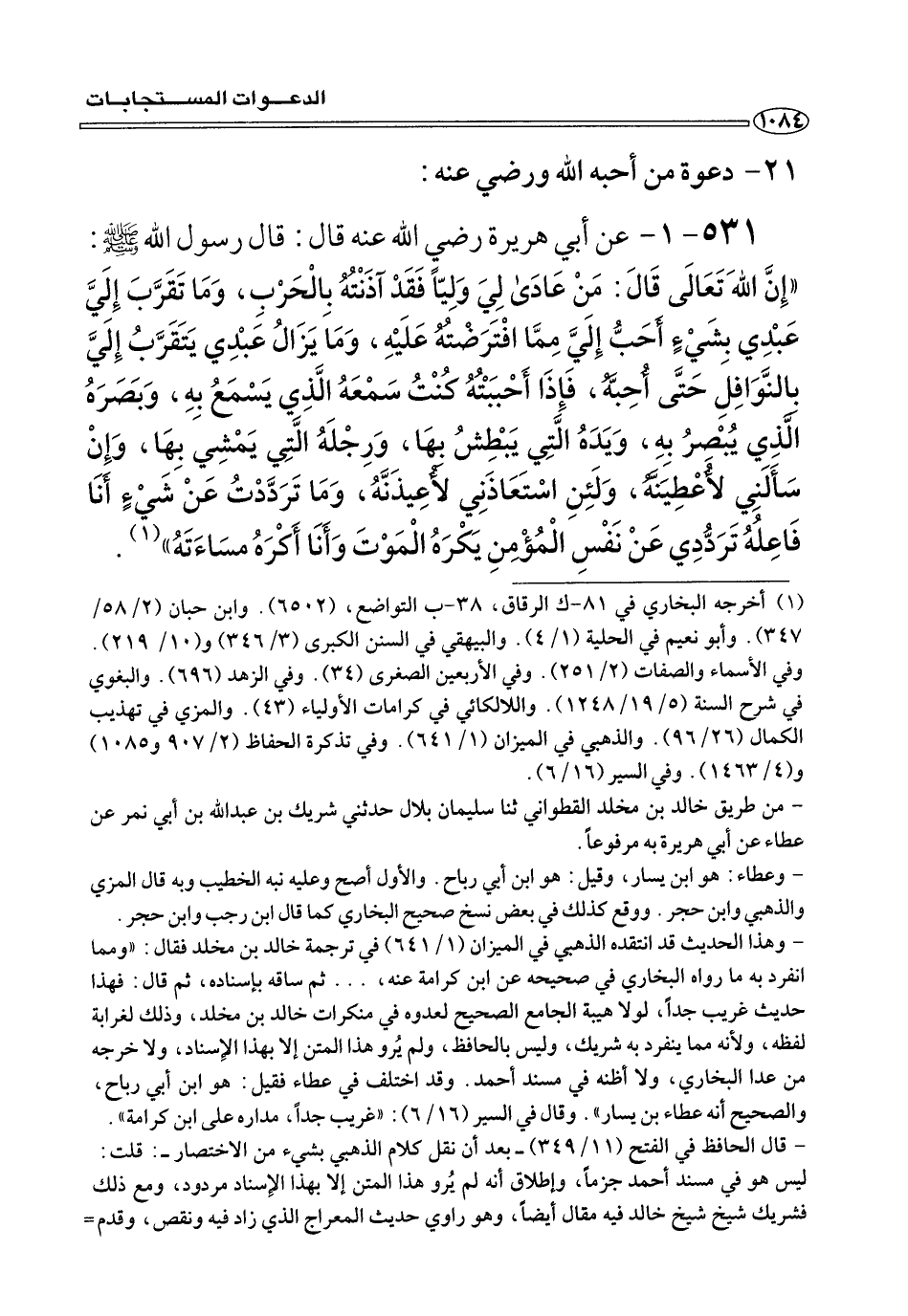 ٥٣١ - ١ عن أَبِي هريرة رضي الله عه قَالَ: قَالَ رسول الله صلى الله عليه وسلم: «إِنَّ اللهَ تَعَالَى قَالَ: مَنْ عَادَى لِي وَليًّا فَقَدْ آذَنْتُهُ بِالْحَرْبِ، وَمَا تَقَرَّبَ إِلَيَّ عَبْدِي بِشَيْءٍ أَحَبُّ إِلَيَّ مِمَّا افْتَرَضْتُهُ عَلَيْهِ، وَمَا يَزَالُ عَبْدِي يَتَقَرَّبُ إِلَيَّ بِالنَّوَافِل حَتَّى أُحِبَّهُ، فَإِذَا أَحْبَبْتُهُ كُنْتُ سَمْعَهُ الَّذِي يَسْمَعُ بِهِ، وَبَصَرَهُ الَّذِي يُبْصِرُ بِهِ، وَيَدَهُ الَّتِي يَبْطِشُ بِهَا، وَرِجْلَهُ الَّتِي يَمْشِي بِهَا، وَإِنْ سَأَلَنِي لأُعْطِيَنَّهُ وَلَئِنِ اسْتَعَاذَنِي لأُعِيذَنَّهُ، وَمَا تَرَدَّدْتُ عَنْ شَيْءٍ أَنَا فَاعِلُهُ تَرَدُّدِي عَنْ نَفْسِ الْمُؤْمِنِ يَكْرَهُ الْمَوْتَ وَأَنَا أَكْرَهُ مسَاءَتَهُ» (¬١).