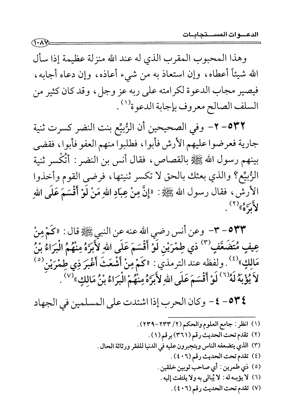 ٥٣٣ - ٣ - وعن أنس رضي الله عنه عن النبي صلى الله عليه وسلم قَالَ: «كَمْ مِنْ عِيفٍ مُتَضَعَّفٍ (¬٣) ذِي طِمْرَيْنِ لَوْ أَقْسَمَ عَلَى اللهِ لأَبَرَّهُ مِنْهُمُ الْبَرَاءُ بْنُ مَالِكٍ» (¬٤). ولفظه عِنْدَ الترمذي: «كَمْ مِنْ أَشْعَثَ أَغَبَرَ ذِي طِمْرَيْنِ (¬٥) لَا يُؤْبَهُ لَهُ (¬٦) لَوْ أَقْسَمَ عَلَى اللهِ لأَبَرَّهُ مِنْهُمْ الْبَرَاءُ بْنُ مَالِكٍ» (¬٧).