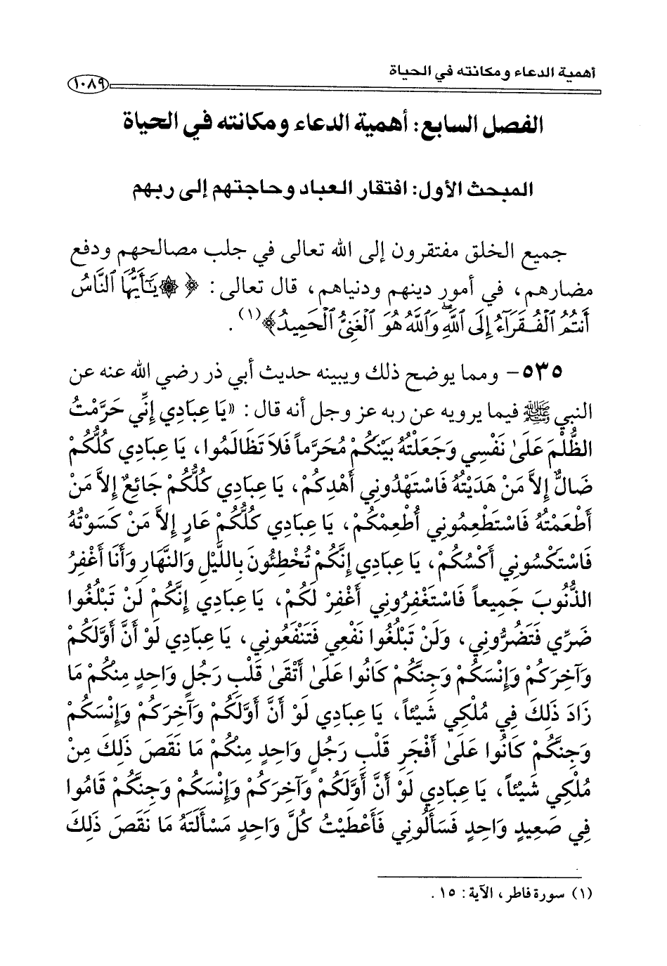 ٥٣٥ - ومما يوضح ذَلِكَ ويبينه حديث أبى ذر رضي الله عنه عن النبي صلى الله عليه وسلم فيما يرويه عن ربه عَزَّ وَجَلَّ أنه قَالَ: «يَا عِبَادِي إِنِّي حَرَّمْتُ الظُّلْمَ عَلَى نَفَسْي وَجَعَلْتُهُ بَيْنَكُمْ مُحَرَّمًا فَلَا تَظَالَمُوا، يَا عِبَادِي كُلُّكُمْ ضَالٌّ إِلَّا مَنْ هَدَيْتُهُ فَاسْتَدْونِي أَهْدِكُمْ، يَا عِبَادِي كُلُّكُمْ جَائِعٌ إِلَّا مَنْ أَطْعَمْتُهُ فَاسْتَطْعِمُونِي أُطْعِمْكُمْ، يَا عِبَادِي كُلُّكُمْ عَارٍ إِلَّا مَنْ كَسَوْتُهُ فَاسْتَكْسُونِي أَكْسُكُمْ، يَا عِبَادِي إِنَّكُمْ تُخْطِئُونَ بِاللَّيْلِ وَالنَّهَارِ وَأَنَا اغْفِرْ الذُّنُوبَ جَمِيعًا فَاسْتَغْفِرُونِي اغْفِرْ لَكُمْ، يَا عِبَادِي إِنَّكُمْ لَنْ تَبْلُغُوا ضَرِّي فَتَضُرُّونِي، وَلَنْ تَبْلُغُوا نَفْعِي فَتَنْفَعُونِي، يَا عِبَادِي لَوْ أَنَّ أَوَّلَكُمْ وَآخِرَكُمْ وَإِنْسَكُمْ وَجِنَّكُمْ كَانُوا عَلَى أَتْقَى قَلْبِ رَجُلٍ وَاحِدٍ مِنْكُمْ مَا زَادَ ذَلِكَ فِي مُلْكِي شَيْئًا، يَا عِبَادِي لَوْ أَنَّ أَوَّلَكُم وَآخِرَكُمْ وَإِنْسَكُمْ وَجِنَّكُمْ كَانُوا عَلَى أَفْجَرِ قَلْبِ رَجُلٍ وَاحِدٍ مِنْكُمْ مَا نَقَصَ ذَلِكَ مِنْ مُلْكِي شَيْئًا، يَا عِبَادِي لَوْ أَنَّ أَوَّلَكُمْ وَآخِرَكُمْ وَإِنْسَكُمْ وَجِنَّكُمْ قَامُوا فِي صَعِيدٍ وَاحِدٍ فَسَأَلُونِي فَأَعْطَيْتُ كُلَّ وَاحِدٍ مَسْأَلَتَهُ مَا نَقَصَ ذَلِكَ