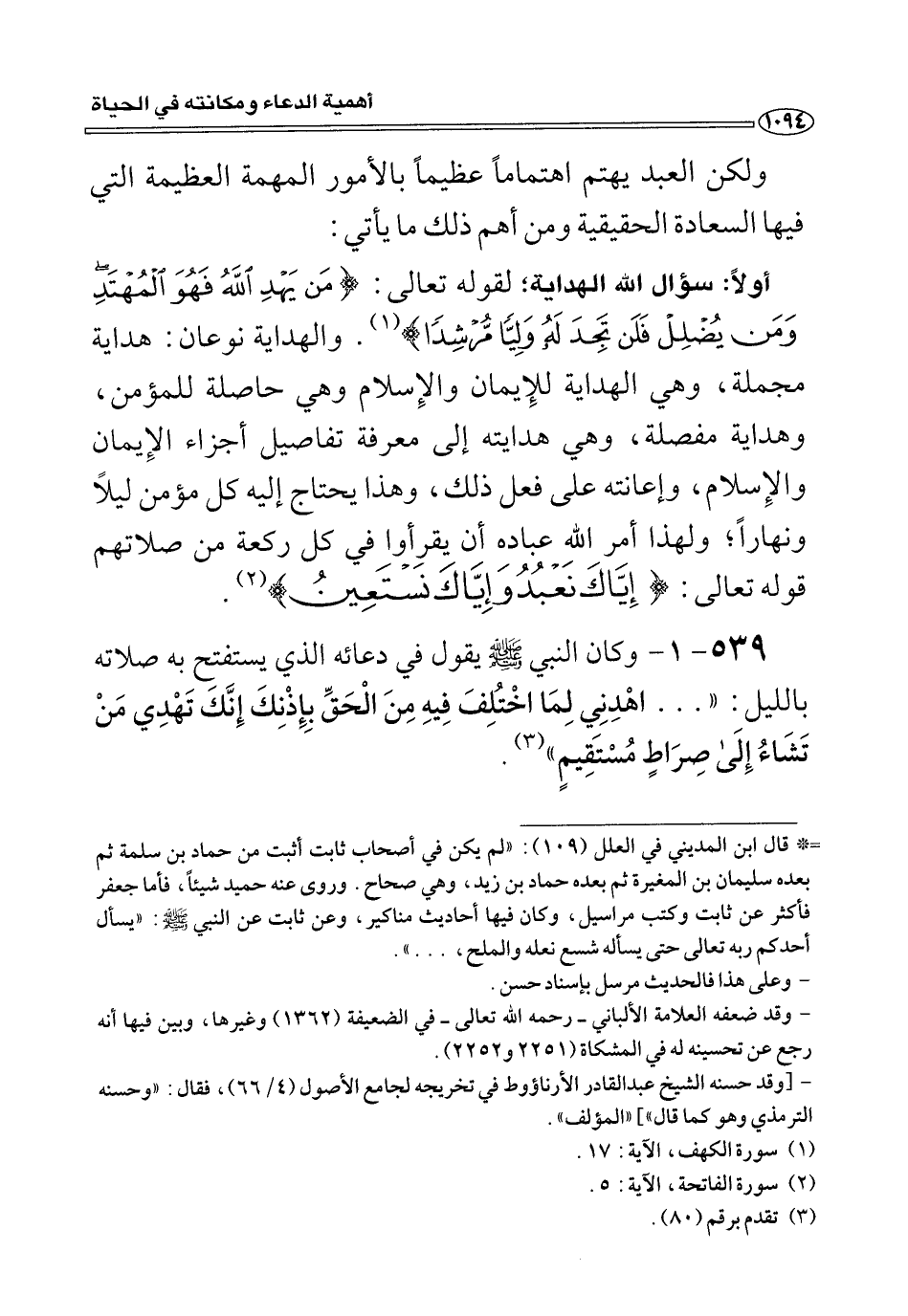 ٥٣٩ - ١ - وكَانَ النبي صلى الله عليه وسلم يَقُولُ في دعائه الَّذِي يستفتح بِهِ صلاته بالليل: « .... اهْدِنِي لِمَا اخْتُلِفَ فِيهِ مِنَ الْحَقِّ بِإِذْنِكَ إِنَّكَ تَهْدِي مَنْ تَشَاءُ إِلَى صِرَاطٍ مُسْتَقِيمٍ» (¬٣).