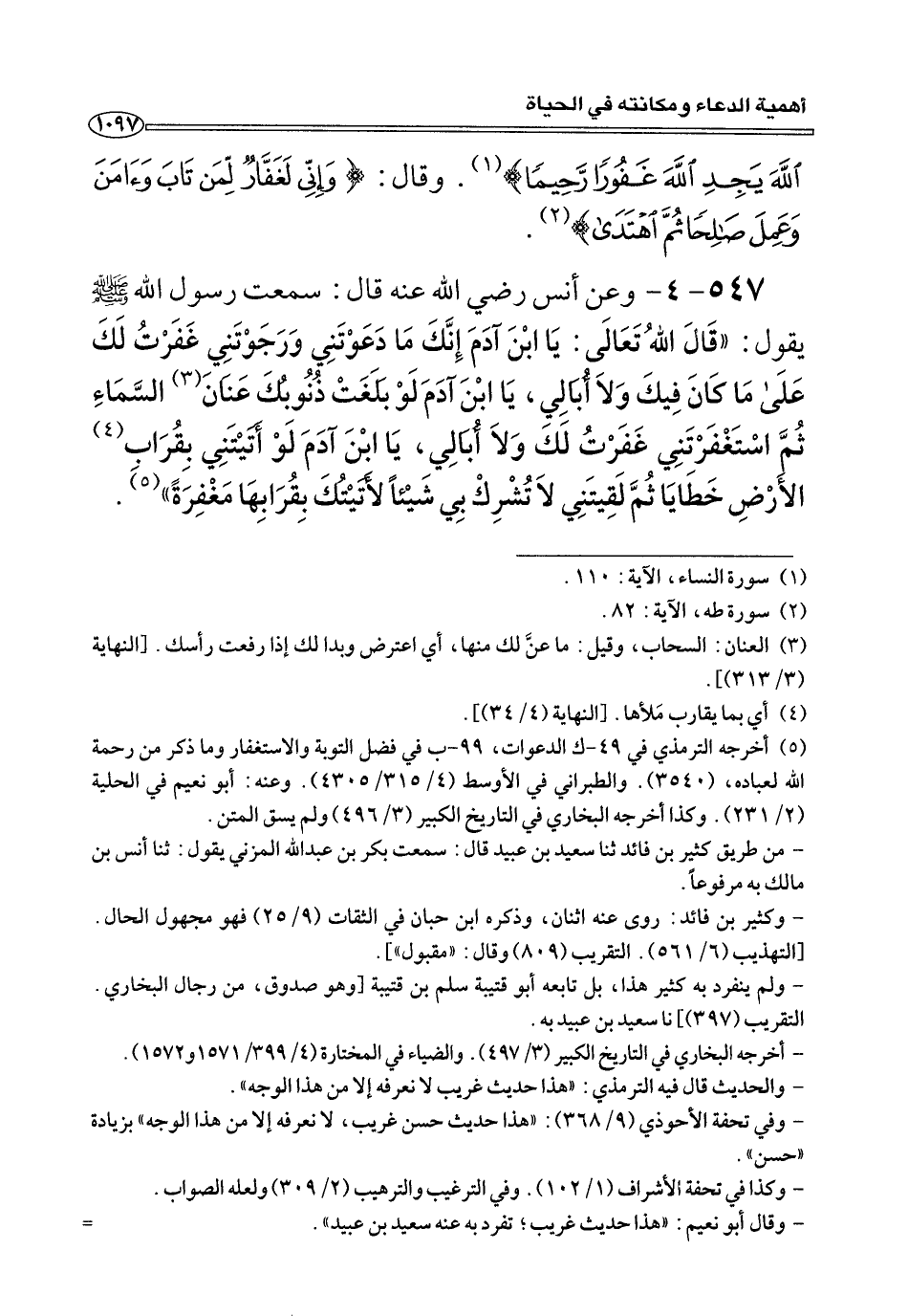 ٥٤٧ - ٤ - وعن أنس رضي الله عنه قَالَ: سمعت رسول الله صلى الله عليه وسلم يَقُولُ: «قَالَ اللهُ تَعَالَى: يَا ابْنَ آدَمَ إِنَّكَ مَا دَعَوْتَني وَرَجَوْتَنِي غَفَرْتُ لَكَ عَلَى مَا كَانَ فِيكَ وَلَا أُبَالِي، يَا ابْنَ آدَمَ لَوْ بَلَغَتْ ذُنُوبُكَ عَنَانَ (¬٣) السَّمَاءِ ثُمَّ اسْتَغْفَرْتَنِي غَفَرْتُ لَكَ وَلَا أُبَالِي، يَا ابْنَ آدَمَ لَوْ أَتَيْتَنِي بِقُرَابِ (¬٤) الأَرْضِ خَطَايَا ثُمَّ لَقِيتَنِي لَا تُشْرِكْ بِي شَيْئًا لأَتَيْتُكَ بِقُرَابِهَا مَغْفِرَةً» (¬٥) .