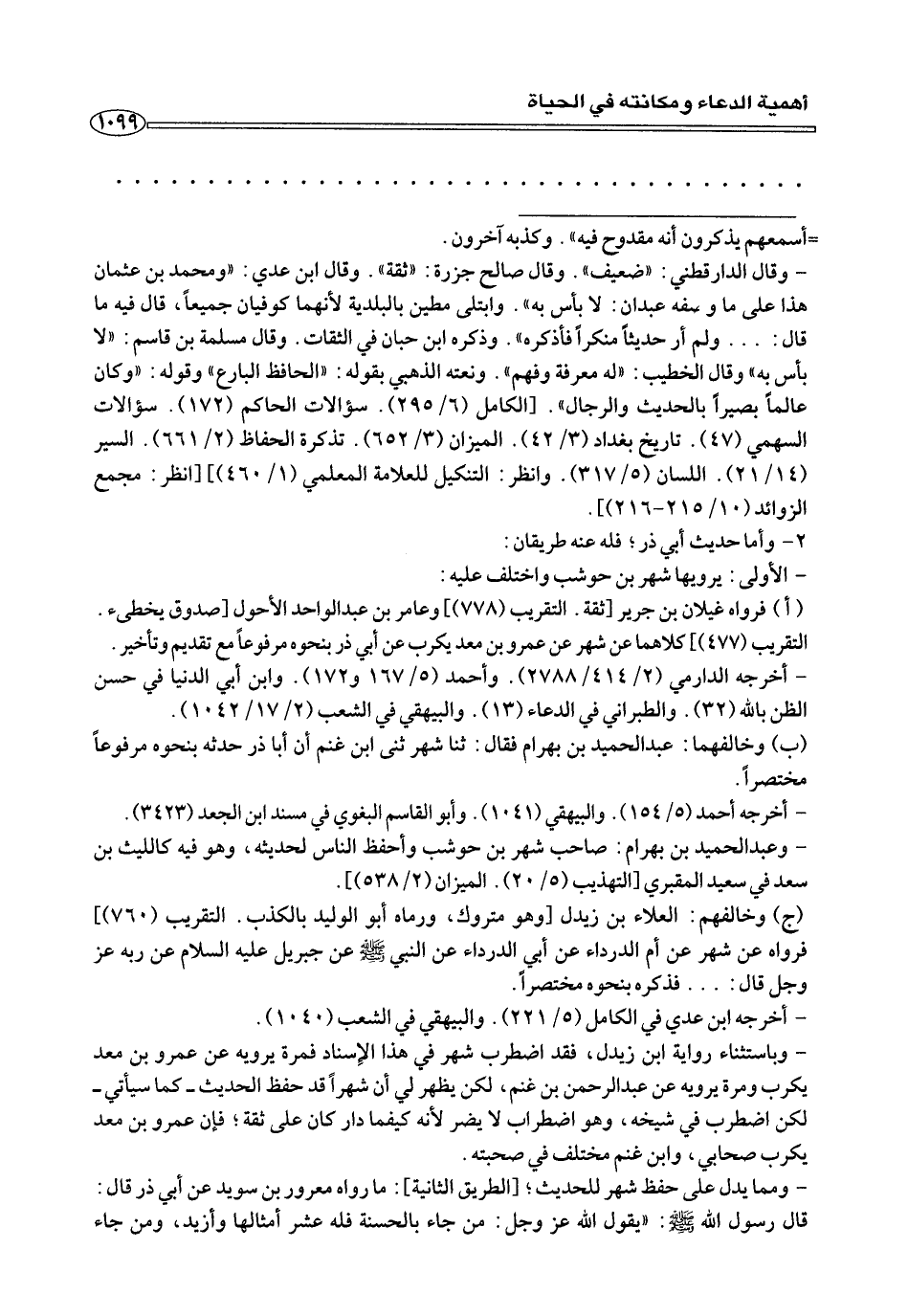 (أ) فرواه غيلان بن جرير [ثقة. التقريب (٧٧٨)] وعامر بن عبد الواحد الأحول [صدوق يخطئ. التقريب (٤٧٧)] كلاهما عن شهر عن عمرو بن معد يكرب عن أبي ذر بنحوه مرفوعًا مع تقديم وتأخير.