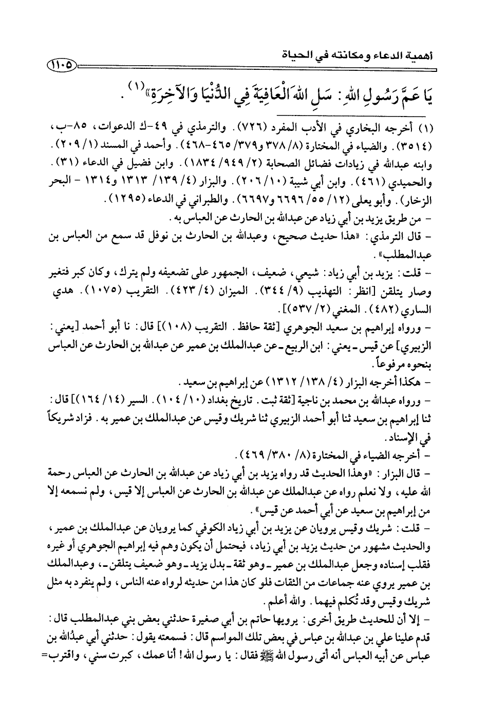 يَا عَمَّ رَسُولِ اللهِ: سَلِ اللهَ الْعَافِيَةَ فِي الدُّنْيَا وَالآخِرَةِ» (¬١) .