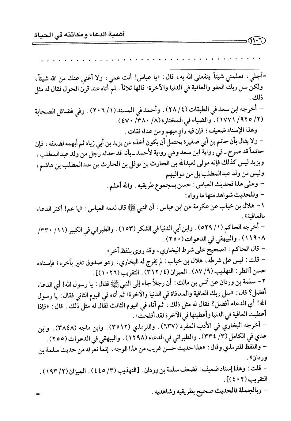 ١ - هلال بن خباب عن عكرمة ابن عباس: أن النبي صلى اله عليه وسلم قال لعمه العباس: «يا عم! أكثر الدعاء بالعافية».