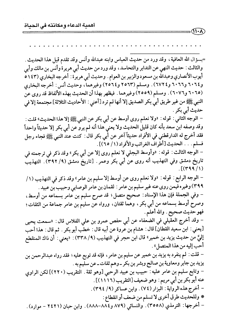 =بسؤال الله العافية، وقد ورد من حديث العباس وابنه عبدالله وأنس وقد قدم قبل هذا الحديث. والثالث: حديث النهي عن التدابر والتحاسد، وقد ورد من حديث أبي هريرة وأنس بن مالك وأبي أيوب الأنصاري وعبدالله بن مسعود والزبير بن العوام. وحديث أبي هريرة: أخرجه البخاري (٥١٤٣ و ٦٠٦٤ و ٦٠٦٦ و ٦٧٢٤). ومسلم (٢٥٥٩) وغيرهما. فيظهر بهذا ا، الحديث بهذه الألفاظ قد روى عن النبي صلى الله عليه وسلم من غير طريق أبي بكر الصديق إلا أنها لم ترد [أعني: الأحاديث الثلاثة] مجتمعة إلا في حديث أبي بكر.