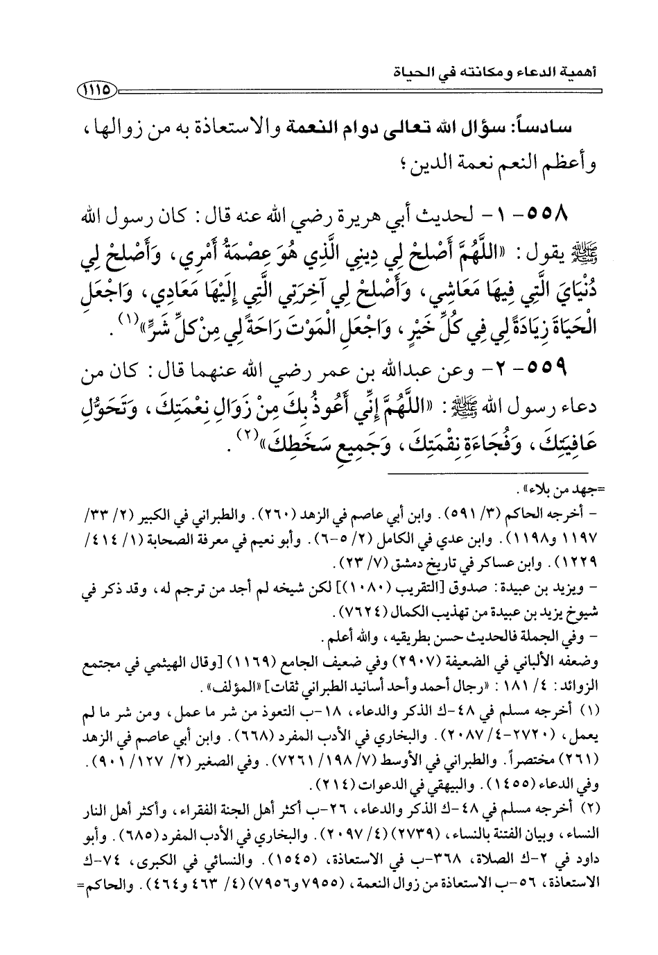 ٥٥٨ - ١ - لحديث أَبِي هريرة رضي الله عنه قَالَ: كَانَ رسول الله صلى الله عليه وسلم يَقُولُ: «اللَّهُمَّ أَصْلِحْ لِي دِينِي الَّذِي هُوَ عِصْمَةُ أَمْرِي، وَأَصْلِحْ لِي دُنْيَايَ الَّتِي فِيهَا مَعَاشِي، وَأَصْلِحْ لِي آخِرَتِي الَّتِي إِلَيْهَا مَعَادِي، وَاجْعَلِ الْحَيَاةَ زِيَادَةً لِي فِي كلِّ خَيْرٍ، وَاجْعَلِ الْمَوْتَ رَاحَةً لِي مِنْ كُلِّ شَرٍّ» (¬١).