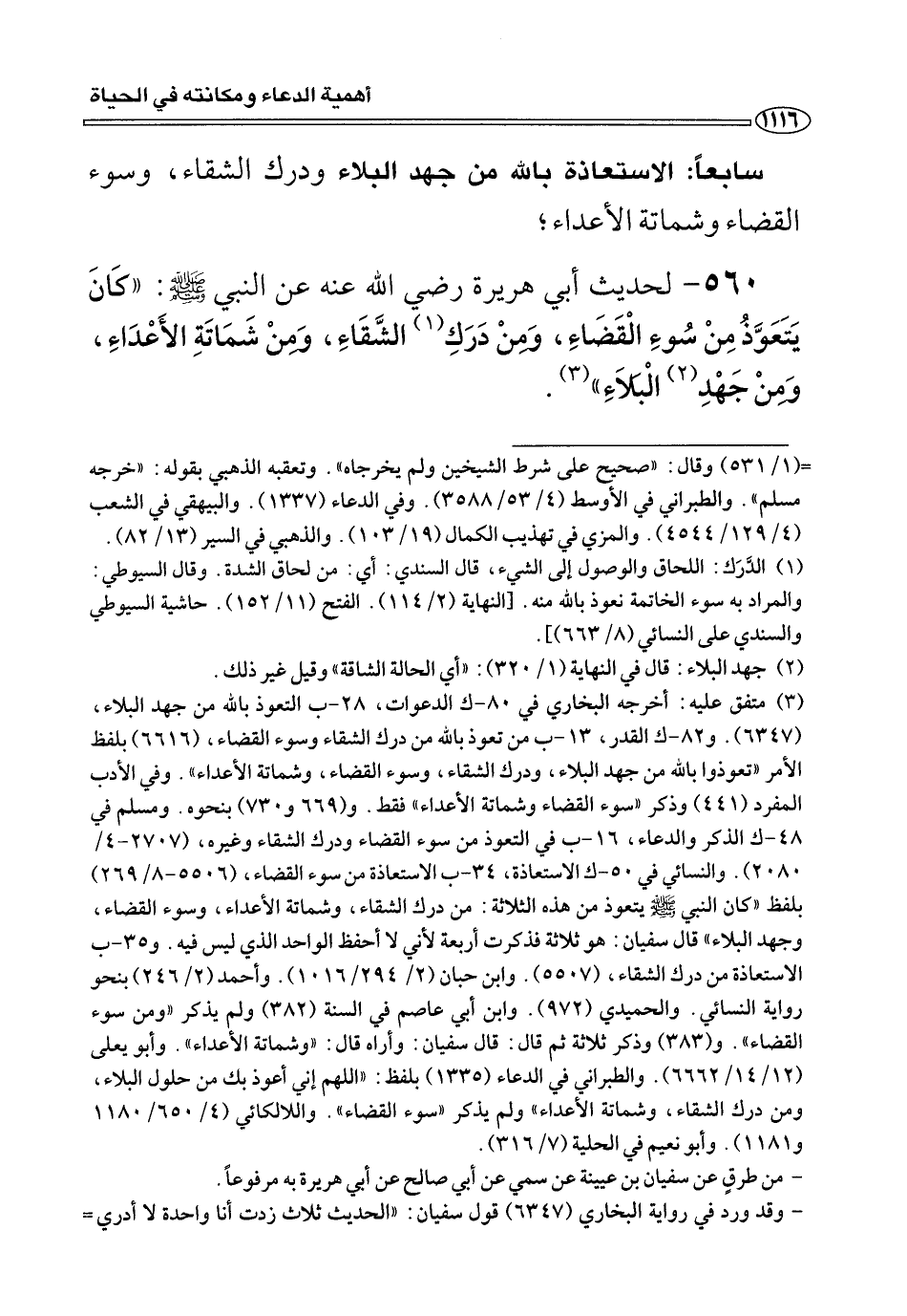 (¬٣) متفق عليه: أخرجه البخاري في ٨٠ - ك الدعوات، ٢٨ - ب التعوذ بالله من جهد البلاء، (٦٣٤٧). و ٨٢ - ك القدر، ١٣ - ب من تعوذ بالله من درك الشقاء وسوء القضاء، (٦٦١٦) بلفظ الأمر» تعوذوا بالله من جهد البلاء، ودرك الشقاء، وسوء القضاء، وشماتة الأعداء». وفي الأدب المفرد (٤٤١) وذكر» سوء القضاء وشماتة الأعداء». و (٦٦٩ و ٧٣٠) بنحوه. ومسلم في ٤٨ - ك الذكر والدعاء، ١٦ - ب في التعوذ من سوء القضاء ودرك الشقاء وغيره، (٢٧٠٧ - ٤/ ٢٠٨٠). والنسائي في ٥٠ - ك الاستعاذة، ٣٤ - ب الاستعاذة من سوء القضاء، (٥٥٠٦ - ٨/ ٢٦٩) بلفظ» كان النبي صلى الله عليه وسلم يتعوذ من هذه الثلاثة: من درك الشقاء، وشماتة الأعداء، وسوء القضاء، وجهد البلاء» قال سفيان: هو ثلاثة فذكرت أربعة لأني لا أحفظ الواحد الذي ليس فيه. و ٣٥ - ب الاستعاذة من درك الشقاء، (٥٥٠٧). وابن حبان (٢/ ٢٩٤/ ١٠١٦). وأحمد (٢/ ٢٤٦) بنحو رواية النسائي. والحميدي (٩٧٢). وابن أبي عاصم في السنة (٣٨٢) وَلَمْ يذكر» ومن سوء القضاء». و (٣٨٣) وذكر ثلاثة ثم قال: قال سفيان: وأراه قال: «وشماتة الأعداء». وأبو يعلي (١٢/ ١٤/ ٦٦٦٢). والطبراني في الدعاء (١٣٣٥) بلفظ: «اللهم إني أعوذ بك من حلول البلاء، ومن درك الشقاء، وشماتة الأعداء» وَلَمْ يذكر» سوء القضاء». اللالكائي (٤/ ٦٥٠/ ١١٨٠ و ١١٨١). وأبو نعيم في الحلية (٧/ ٣١٦).