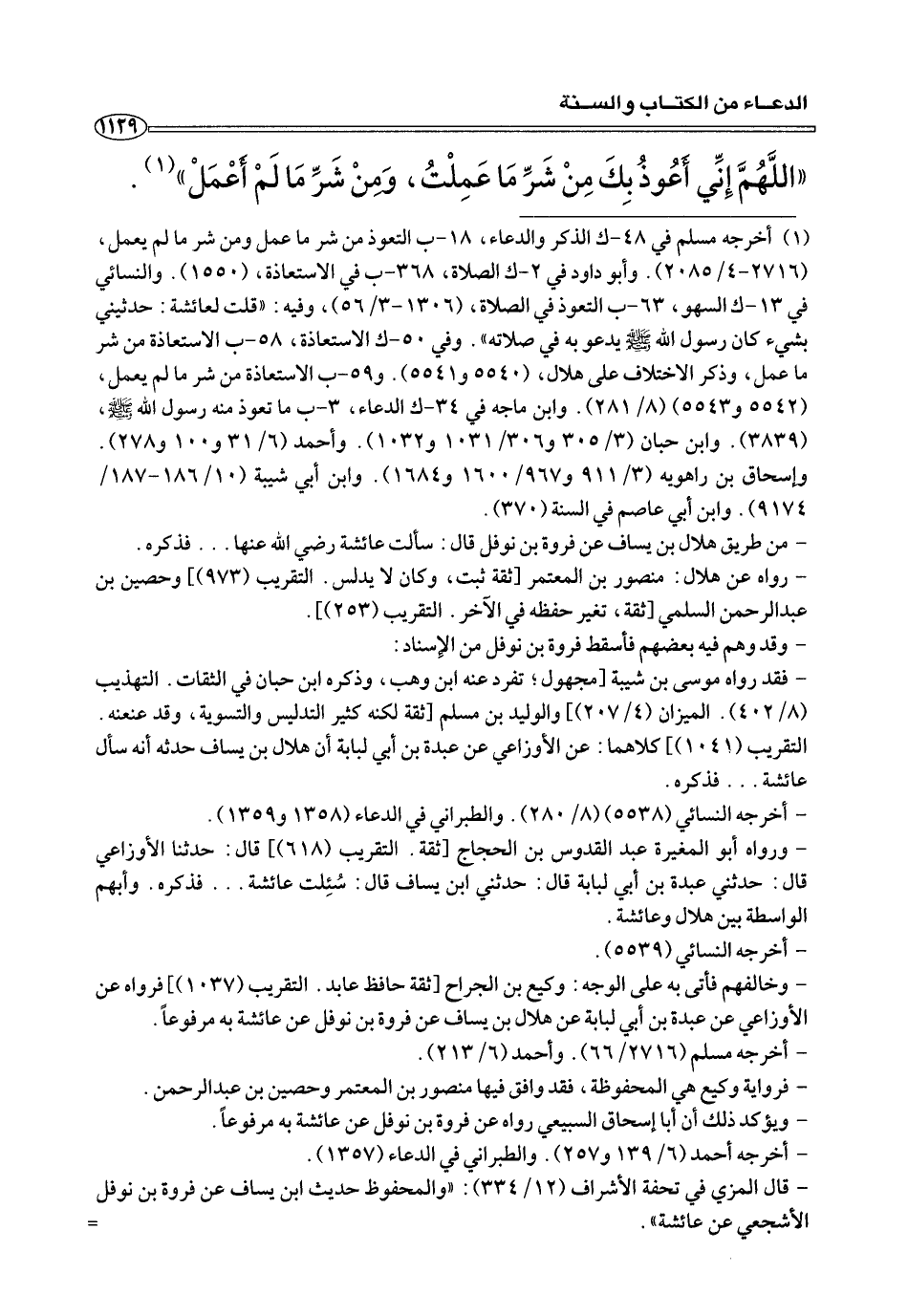 (¬١) أخرجه مسلم في ٤٨ - ك الذكر والدعاء، ١٨ - ب التعوذ من شر ما عمل ومن شر ما لم يعمل، (٢٧١٦ - ٤/ ٢٠٨٥). وأبو داود في ٢ - ك الصلاة، ٣٦٨ - ب في الاستعاذة، (١٥٥٠). والنسائي في ١٣ - ك السهو، ٦٣ - ب التعوذ في الصلاة، (١٣٠٦ - ٣/ ٥٦)، وفيه: «قلت لعائشة: حدثيني بشيء كان رسول الله صلى الله عليه وسلم يدعو به في صلاته». وفي ٥٠ - ك الاستعاذة، ٥٨ - ب الاستعاذة من شر ما عمل، وذكر الاختلاف على هلال، (٥٥٤٠ و ٥٥٤١). و ٥٩ - ب الاستعاذة من شر ما لم يعمل، (٥٥٤٢ و ٥٥٤٣) (٨/ ٢٨١). وابن ماجه في ٣٤ - ك الدعاء،٣ - ب ما تعوذ منه رسول الله صلى الله عليه وسلم، (٣٨٣٩). وابن حبان (٣/ ٣٠٥ و ٣٠٦/ ١٠٣١ و ١٠٣٢). وأحمد (٦/ ٣١ و ١٠٠ و ٢٨٧). وإسحاق بن راهوية (٣/ ٩١١ و ٩٦٧/ ١٦٠٠ و ١٦٨٤). وابن أبي شيبه (١٠/ ١٨٦ - ١٨٧/ ٩١٧٤). وابن أبي عاصم في السنة (٣٧٠).