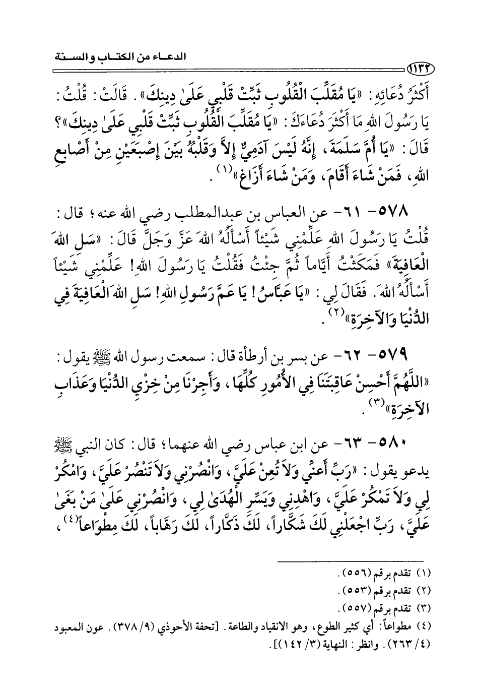 ٥٨٠ - ٦٣ - عن ابن عباس رضي الله عنهما؛ قَالَ: كَانَ النبي صلى الله عليه وسلم يدعن يَقُولُ: «رَبِّ أَعِنِّي وَلَا تُعِنْ عَلَيَّ، وَانْصُرْنِي وَلَا تَنْصُرْ عَلَيَّ، وَامْكُرْ لِي وَلَا تَمْكُرْ عَلَيَّ، وَاهْدِنِي وَيَسِّرِ الْهُدَى لِي، وَانْصُرْنِي عَلَى مَنْ بَغَى عَلَيَّ، رَبِّ اجْعَلْنِي لَكَ شَكَّارًا، لَكَ ذَكَّارًا، لَكَ رَهَّابًا، لَكَ مِطْوَاعًا (¬٤) ،