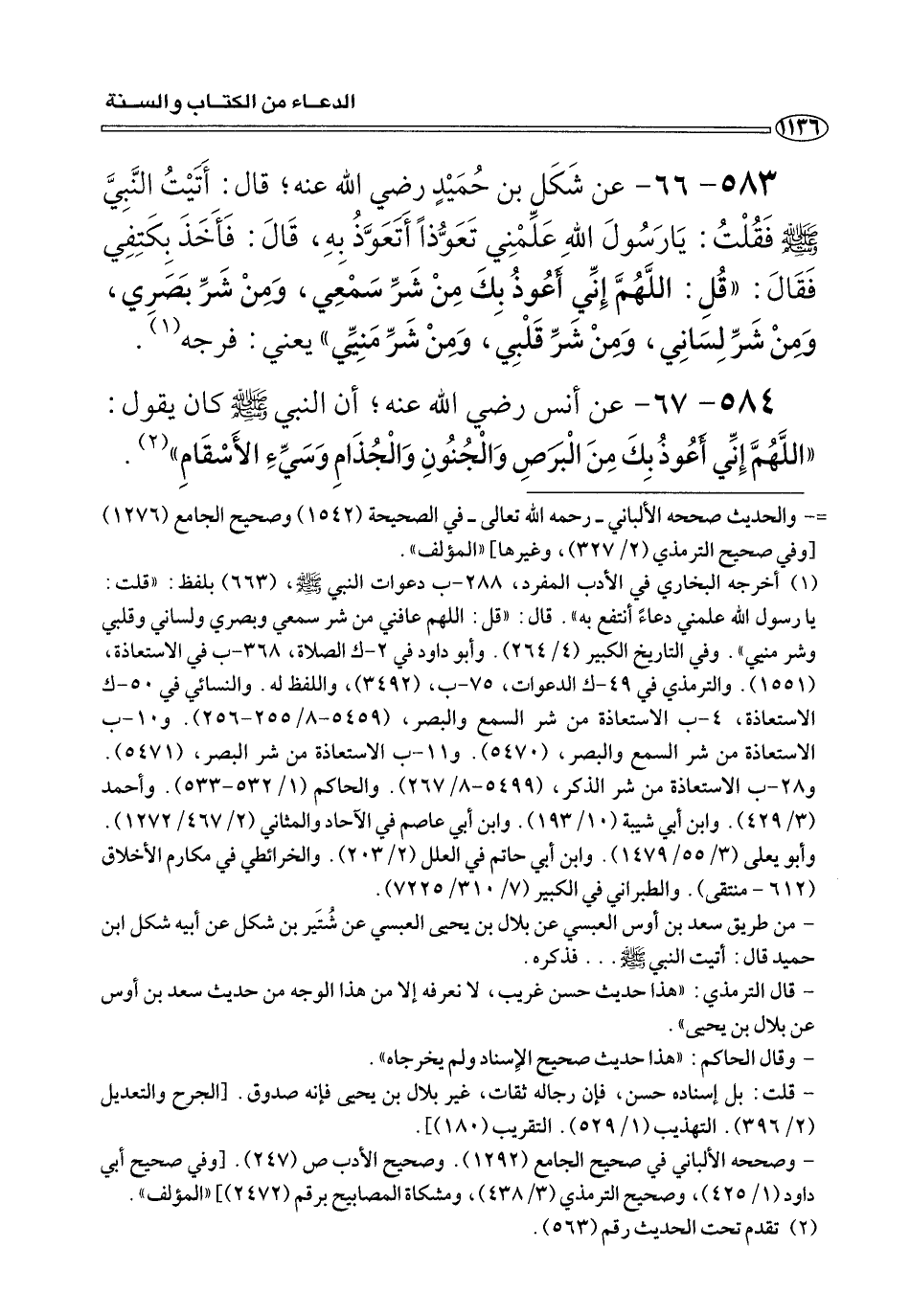 ٥٨٣ - ٦٦ - عن شَكَل بن حُمَيْدٍ رضي الله عنه؛ قَالَ: أَتَيْتُ النَّبِيَّ صلى الله عليه وسلم فَقُلْتُ: يَا رَسُولَ اللهِ عَلِّمْنِي تَعَوُّذًا أَتَعَوَّذُ بِهِ، قَالَ: فَأَخَذَ بِكَتِفِي فقَالَ: «قُلِ: اللَّهُمَّ إِنِّي أَعُوذُ بِكَ مِنْ شَرِّ سَمْعِي، وَمِنْ شَرِّ بَصَرِي، وَمِنْ شَرِّ لِسَانِي، وَمِنْ شَرِّ قَلْبِي، وَمِنْ شَرِّ مَنِيِّي» يعني: فرجه (¬١) .