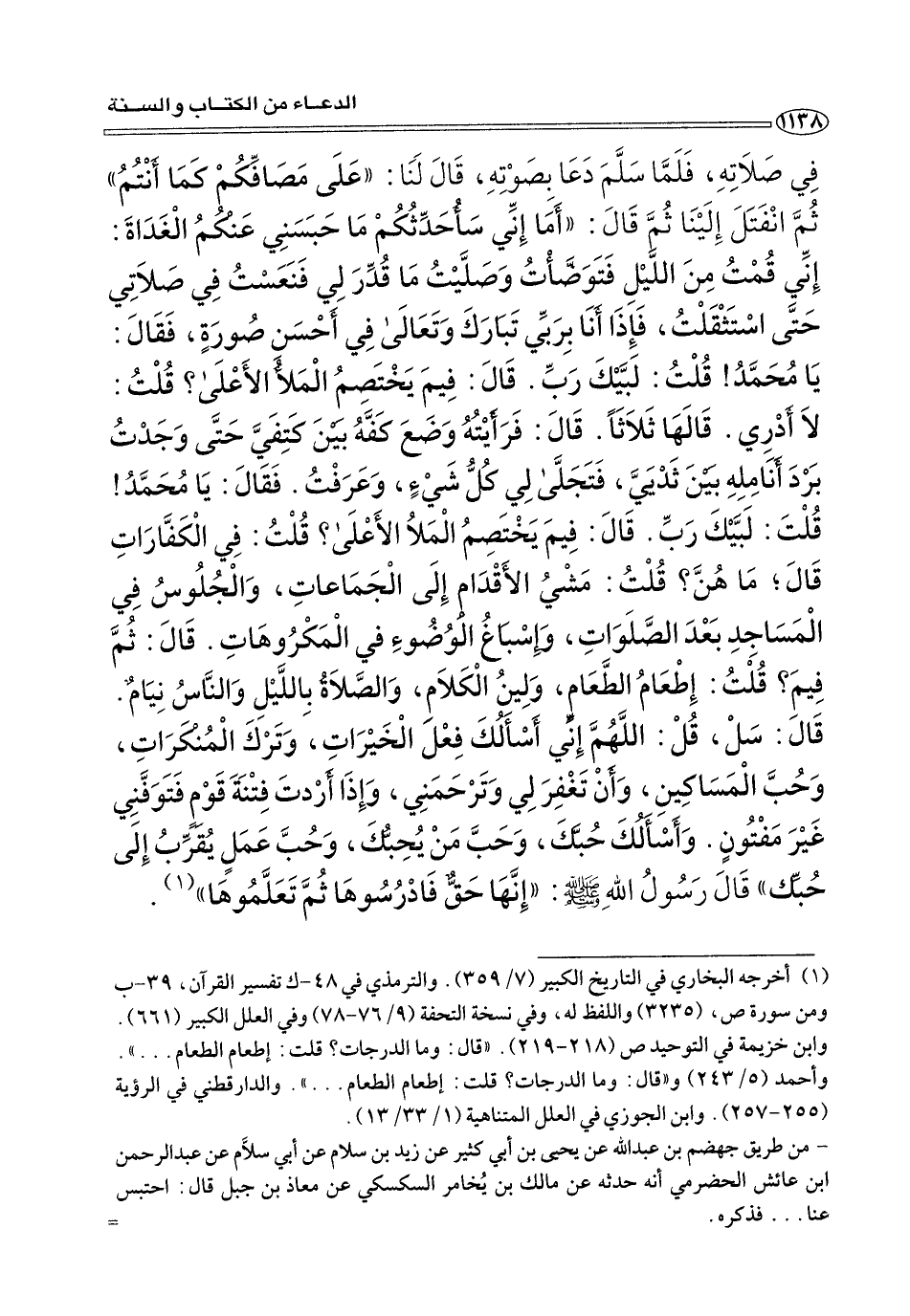 (¬١) أخرجه البخاري في التاريخ الكبير (٧/ ٣٥٩). والترمذي في ٤٨ - ك تفسير القرآن، ٣٩ - ب ومن سورة ص، (٣٢٣٥) واللفظ له، وفي نسخة التحفة (٩/ ٧٦ - ٧٨) وفي العلل الكبير (٦٦١). وابن خزيمة في التوحيد ص (٢١٨ - ٢١٩).» قال: وما الدرجات؟ قلت: إطعام الطعام ... ». وأحمد (٥/ ٢٤٣) و» قال: وما الدرجات؟ قلت: إطعام الطعام ... ». والدارقطني في الرؤية (٢٥٥ - ٢٥٧). وابن الجوزى في العلل المتناهية (١/ ٣٣/ ١٣).