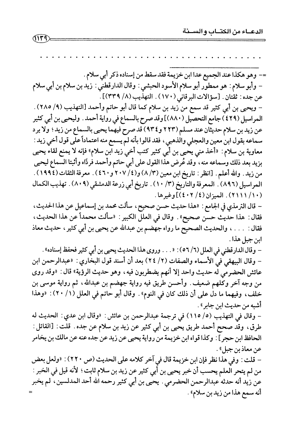 - ويحيي بن أبي كثير قد سمع من زيد بن سلام كما قال أبو حاتم وأحمد [التهذيب (٩/ ٢٨٥). المراسيل (٤٢٩) جامع التحصيل (٨٨٠)] وقد صرح بالسماع في رواية أحمد. وليحي بن أبي كثير عن زيد بن سلام حديثان عند مسلم (٢٢٣ و ٩٣٤) قد صرح فيهما يحيي بالسماع من زيد؛ ولا يرد سماعه بقول ابن معين والعجلي والذهبي، فقد قالوا بأنه لم يسمع منه اعتمادا على قول أخي زيد: معاوية بن سلام: «أخذ مني يحيي بن أبي كثير كتب أخي زيد ابن سلام» فأنه لا يمنع لقاء يحيي يزيد بعد ذلك وسماعه منه، وقد عرض هذا القول على أبي حاتم وأحمد فرداه وأثبتا السماع ليحيي من زيد. والله أعلم. [انظر: تاريخ ابن معين (٣/ ٨) و (٤/ ٢٠٧ و ٤٦٠). معرفة الثقات (١٩٩٤). المراسيل (٨٩٦). المعرفة والتاريخ (٣/ ١٠) تاريخ أبي زرعة الدمشقي (٨٠٩). تهذيب الكمال (١٠/ ٢١١١). الميزان (٤/ ٤٠٢)] وغيرها.