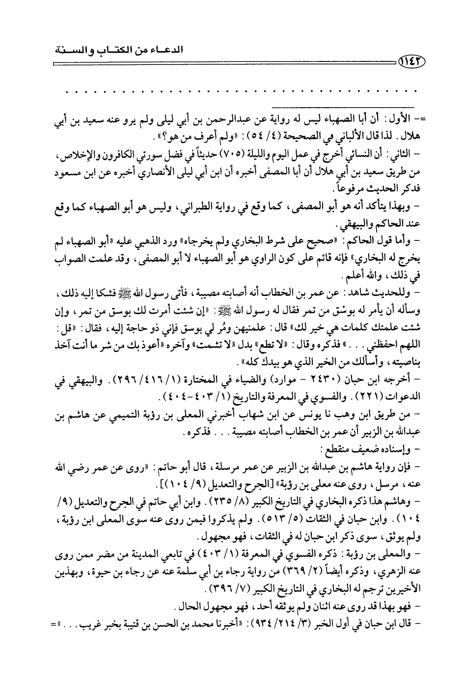 =- الأول: أن أبا الصهباء ليس له رواية عن عبد الرحمن بن أبي ليلي وَلَمْ يرو عنه سعيد بن أبي هلال. لذا قال الألباني في الصحيحة (٤/ ٥٤): «ولم أعرف من هو؟».
