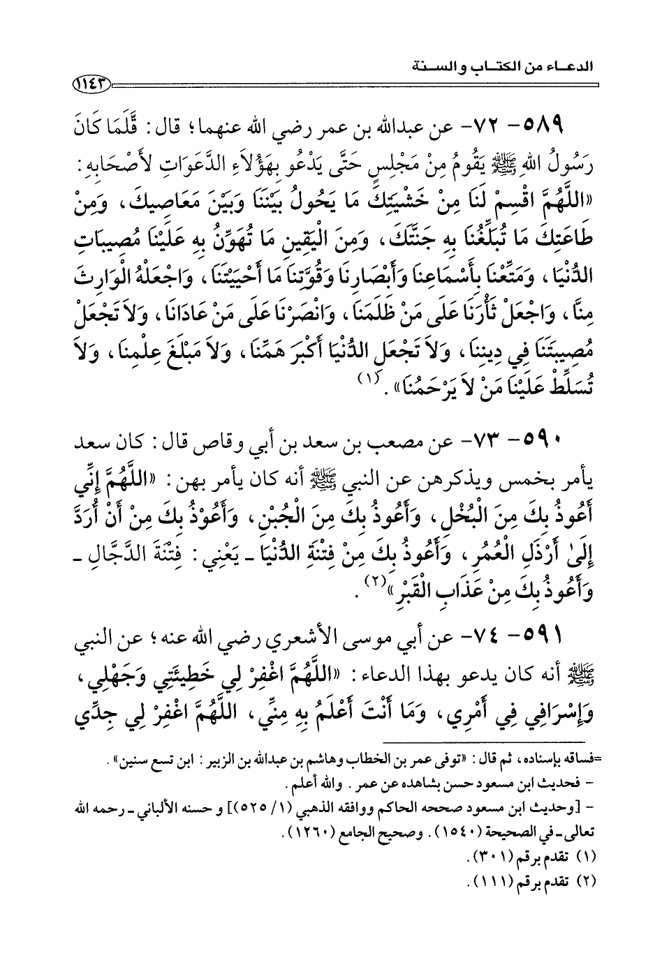 ٥٨٩ - ٧٢ - عن عبد الله بن عمر رضي الله عنهما؛ قَالَ: قَّلَمَا كَانَ رَسُولُ اللهِ صلى الله عليه وسلم يَقُومُ مِنْ مَجْلِسٍ حَتَّى يَدْعُو بِهَؤُلَاءِ الدَّعَوَاتِ لأَصْحَابِهِ: «اللَّهُمَّ اقْسِمْ لَنَا مِنْ خَشْيَتِكَ مَا يَحُولُ بَيْنَنَا وَبَيْنَ مَعَاصِيكَ، وَمِنْ طَاعَتِكَ مَا تُبَلِّغُنَا بِهِ جَنَّتَكَ، وَمِنَ الْيَقِينَ مَا تُهَوِّنُ بِهِ عَلَيْنَا مُصِيبَاتِ الدُّنْيَا، وَمَتِّعْنَا بِأَسْمَاعِنَا وَأَبْصَارِنَا وَقُوَّتِنَا مَا أَحْيَيْتَنَا، وَاجْعَلْهُ الْوَارِثَ مِنَّا، وَاجْعَلْ ثَأْرَنَا عَلَى مَنْ ظَلَمَنَا، وَانْصَرْنَا عَلَى مَنْ عَادَانَا، وَلَا تَجْعَلْ مُصِيبَتَنَا فِي دِينِنَا، وَلَا تَجْعَل الدُّنْيَا أَكْبَرَ هَمِّنَا، وَلَا مَبْلَغَ عِلْمِنَا، وَلَا تُسَلِّطْ عَلَيْنَا مَنْ لَا يَرْحَمُنَا» (¬١) .
