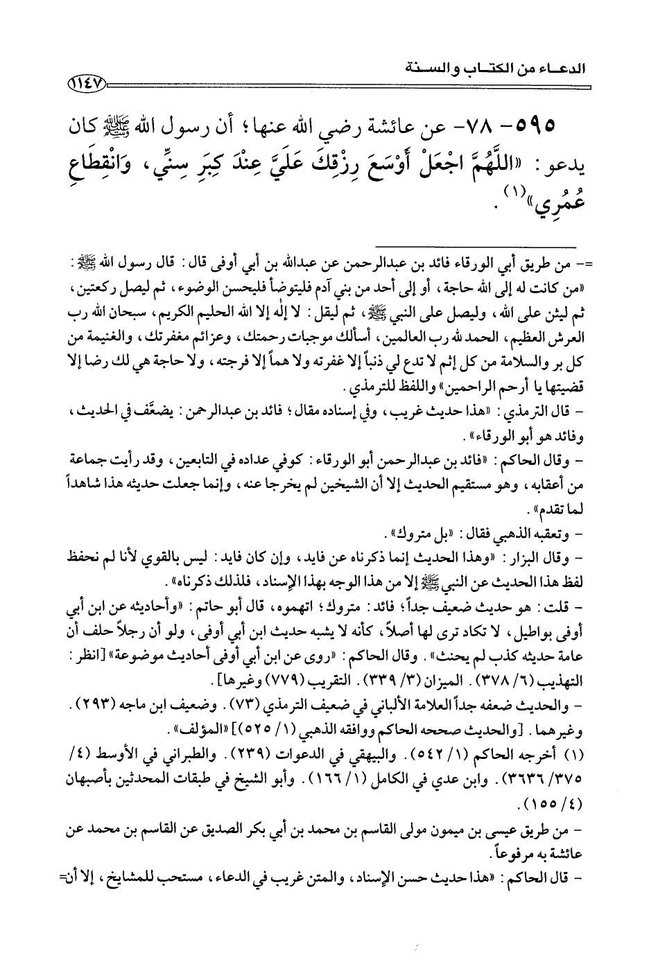 ٥٩٥ - ٧٨ - عن عائشة رضي الله عنها؛ أن رسول الله صلى الله عليه وسلم كَانَ يدعو: «اللَّهُمَّ اجْعَلْ أَوْسَعَ رِزْقِكَ عَلَيَّ عِنْدَ كِبَرِ سِنِّي، وَانْقِطَاعِ عُمُرِي» (¬١) .