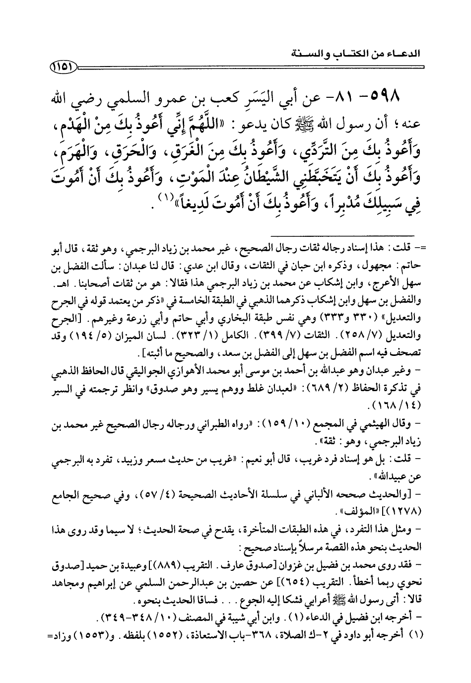 ٥٩٨ - ٨١ - عن أَبِي اليسر كعب بن عمرو السلمي رضي الله عنه؛ أن رسول الله صلى الله عليه وسلم كَانَ يدعو: «اللَّهُمَّ إِنِّي أَعُوذُ بِكَ مِنْ الْهَدْمِ، وَأَعُوذُ بِكَ مِنْ التَّرَدِّي، وَأَعُوذُ بِكَ مِنَ الْغَرَقِ، وَالْحَرَقِ، وَالْهَرَمَ، وَأَعُوذُ بِكَ أَنْ يَتَخَبَّطنِي الشَّيْطَانُ عِنْدَ الْمَوْتِ، وَأَعُوذُ بِكَ أَنْ أَمُوتَ فِي سَبِيِلَكَ مُدْبِرًا، وَأَعُوذُ بِكَ أَنْ أَمُوتَ لَدِيغًا» (¬١).