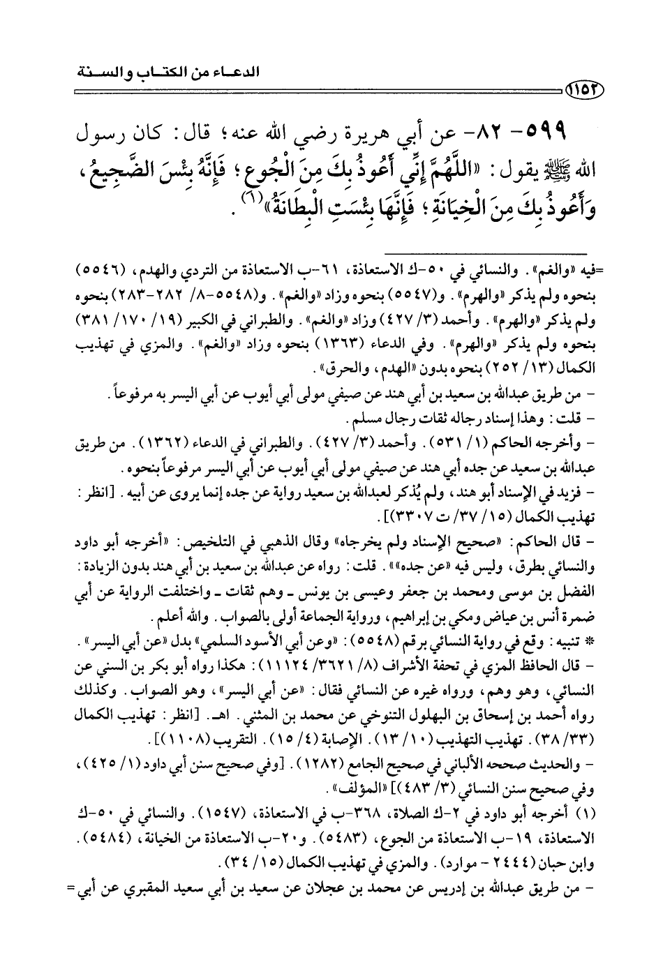 (¬١) أخرجه أبو داود في ٢ - ك الصلاة، ٣٦٨ - ب في الاستعاذة، (١٥٤٧). والنسائي في ٥٠ - ك الاستعاذة، ١٩ - ب الاستعاذة من الجوع، (٥٤٨٣). و ٢٠ - ب الاستعاذة من الخيانة، (٥٤٨٤). وابن حبان (٢٤٤٤ - موارد). والمزي في تهذيب الكمال (١٥/ ٣٤).