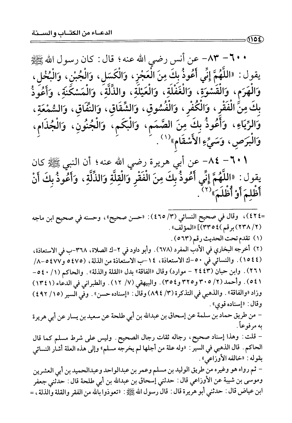 ٦٠٠ - ٨٣ - عن أنس رضي الله عنه؛ قَالَ: كَانَ رسول الله صلى الله عليه وسلم يَقُولُ: «اللَّهُمَّ إِنِي أَعُوذُ بِكَ مِنَ العَجْزِ، وَالْكَسَلِ، وَالْجُبْنِ، وَالْبُخْلِ، وَالْهَرَمٍ، وَالْقَسْوَةِ، وَالْغَفْلَةِ، وَالْعَيْلَةِ، وَالذِّلَّةِ، وَالْمَسْكَنَةِ، وَأَعُوذُ بِكَ مِنَ الْفَقْرِ، وَالْكُفْرِ، وَالْفُسُوقِ، وَالشِّقَاقِ، وَالنِّفَاقِ، وَالسُّمْعَةِ، وَالرِّيَاءِ، وَأَعُوذُ بِكَ مِنَ الصَّمَمِ، وَالْبَكَمِ، وَالْجُنُونِ، وَالْجُذَامِ، وَالْبَرَصِ، وَسَيِّءِ الأَسْقَامِ» (¬١) .