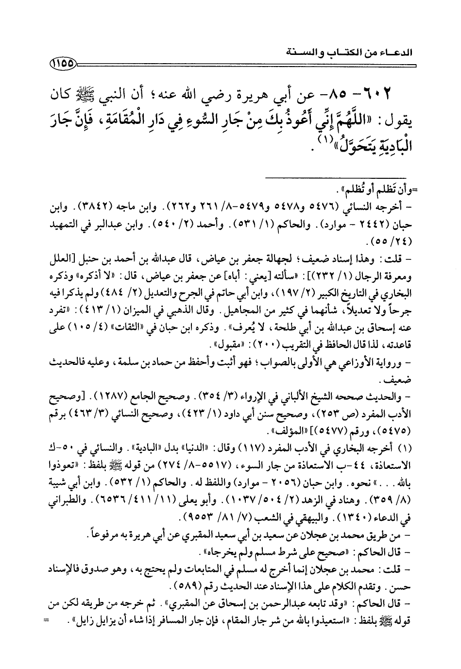 ٦٠٢ - ٨٥ - عن أَبِي هريرة رضي الله عنه؛ أن النبي صلى الله عليه وسلم كَانَ يَقُولُ: «اللَّهُمَّ إِنِّي أَعُوذُ بِكَ مِنْ جَارِ السُّوءِ فِي دِارِ الْمُقَامَةِ، فَإِنْ جَارَ الْبَادِيَةِ يَتَحَوَّلُ» (¬١) .