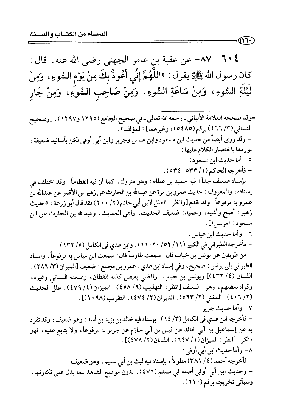 ٦٠٤ - ٨٧ - عن عقبة بن عَامِر الجهني رضي الله عنه، قَالَ: كَانَ رسول الله صلى الله عليه وسلم يَقُولُ: «اللَّهُمَّ إِنِّي أَعُوذُ بِكَ مِنْ يَوْمِ السُّوءِ، وَمِنْ لَيْلَةِ السُّوءِ، وَمِنْ سَاعَةِ السُّوءِ، وَمِنْ صَاحِبِ السُّوءِ، وَمِنْ جَارِ