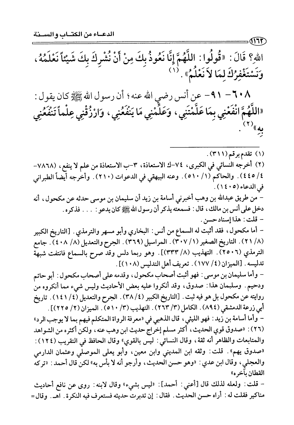 ٦٠٨ - ٩١ - عن أنس رضي الله عنه؛ أن رسول الله صلى الله عليه وسلم كَانَ يَقُولُ: «اللَّهُمَّ انْفَعْنِي بِمَا عَلَّمْتَنِي، وَعَلِّمْنِي مَا يَنْفَعُنِي، وَارْزُقْنِي عِلْمًا تَنْفَعُنِي بِهِ» (¬٢) .
