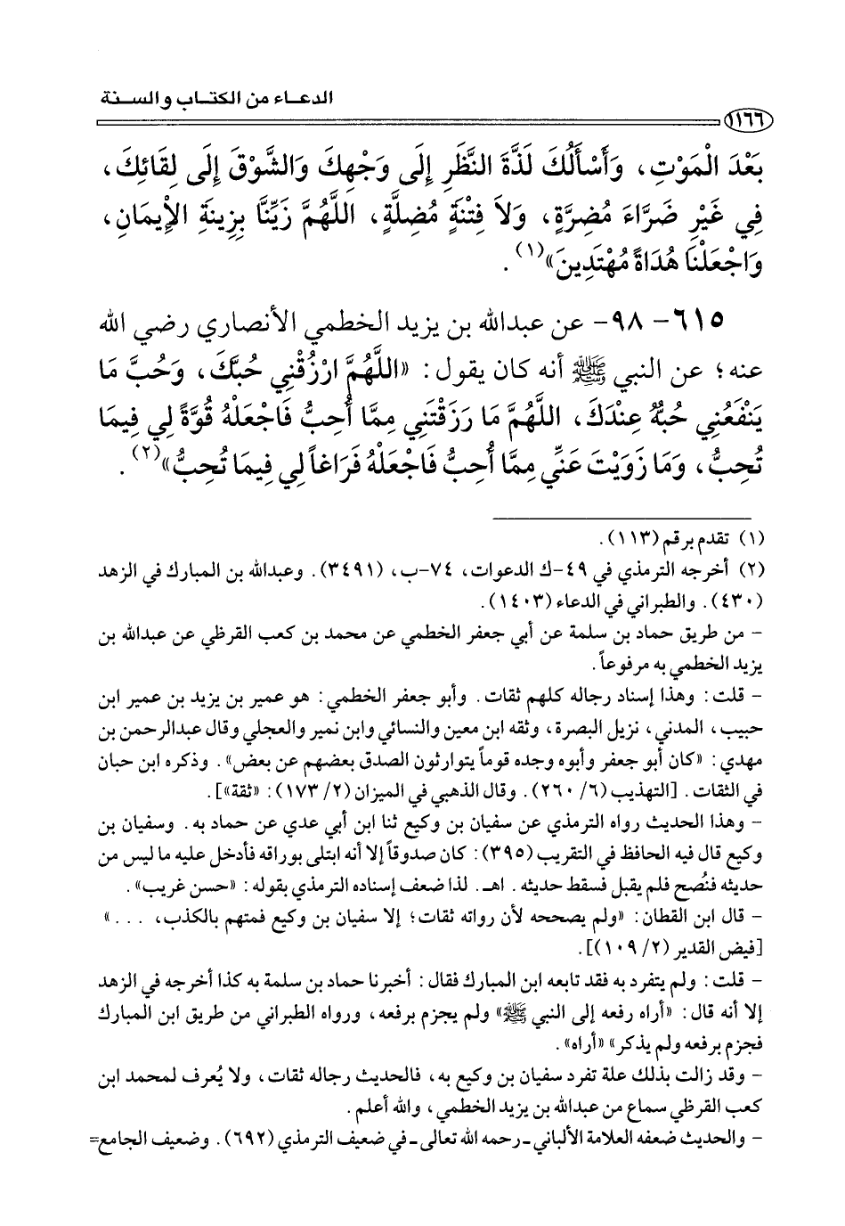 ٦١٥ - ٩٨ - عن عبد الله بن يزيد الخطمي الأنصاري رضي الله عنه؛ عن النبي صلى الله عليه وسلم أنه كَانَ يَقُولُ: «اللَّهُمَّ ارْزُقْنِي حُبَّكَ، وَحُبَّ مَا يَنْفَعُنِي حُبُّهُ عِنْدَكَ، اللَّهُمَّ مَا رَزَقْتَنِي مِمَّا أُحِبُّ فَاجْعَلْهُ قُوَّةً لِي فِيمَا تُحِبُّ، وَمَا زَوَيْتَ عَنِّي مِمَّا أُحِبُّ فَاجْعَلْهُ فَرَاغًا لِي فِيمَا تُحِبُّ» (¬٢) .
