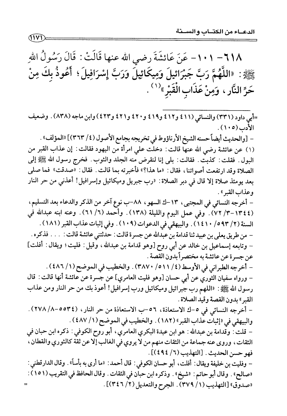 ٦١٨ - ١٠١ - عَنَ عَائشَةَ رضي الله عنها قَالَت: قَالَ رَسُولُ الله صلى الله عليه وسلم: «اللَّهُمَّ رَبَّ جَبْرَائيلَ وَمِيكَائِيلَ وَرَبِّ إِسْرَافِيلَ؛ أَعُوذُ بِكَ مِنْ حَرِّ النَّار، وَمِنْ عَذَابِ الْقَبْرِ» (¬١) .