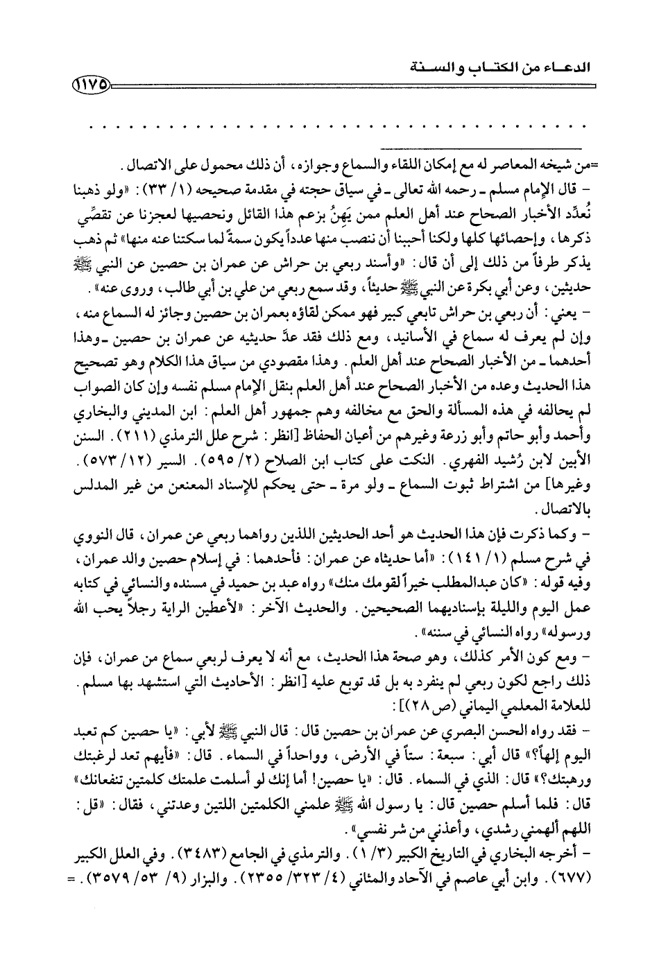 - قال الإمام مسلم- رحمه الله تعالى- في سياق حجته في مقدمة صحيحه (١/ ٣٣): "ولو ذهبنا نعدد الاختبار الصحاح عند أهل العلم من يهن بزعم هذا القائل ونحصيها لعجزنا عن تقصي ذكرها، واحصائها كلها ولكنها أحببنا أن ننصب منها عددا يكون سمة لما سكتنا عنه منها" ثم ذهب يذكر طرفا من ذلك إلى أن قال: "وأسند ربعي بن حراش عن عمران بن حصين عن النبي صلى الله عليه وسلم حديثين، وعن ربعي بن حراش تابعي كبير فهو ممكن لقاؤه بعمران بن حصين وجائز له السماع منه، وإن لم يعرف له سماع في الأسانيد، ومع ذلك فقد عد حديثيه عن عمران بن حصين- وهذا أحدهما- من الأخبار الصحاح عند أهل العلم. وهذا مقصودي من سياق هذا الكلام وهو تصحيح هذا الحديث وعده من الأخبار الصحاح عند أهل العلم بنقل الإمام مسلم نفسه وإن كان الصواب لم يحالفه في هذه المسألة والحق من مخالفه وهم جمهور أهل العلم: ابن المديني والبخاري وأحمد وأبو حاتم وأبو زرعه وغيرهم من أعيان الحفاظ [انظر: شرح علل الترمذي (٢١١). السنن الابين لابن رشيد الفهري. النكت على كتاب ابن الصلاح (٢/ ٥٩٥). السير (١٢/ ٥٧٣). وغيرها] من اشتراط ثبوت السماع- ولو مره- حتى يحكم للإسناد المعنعن من غير المدلس بالاتصال.