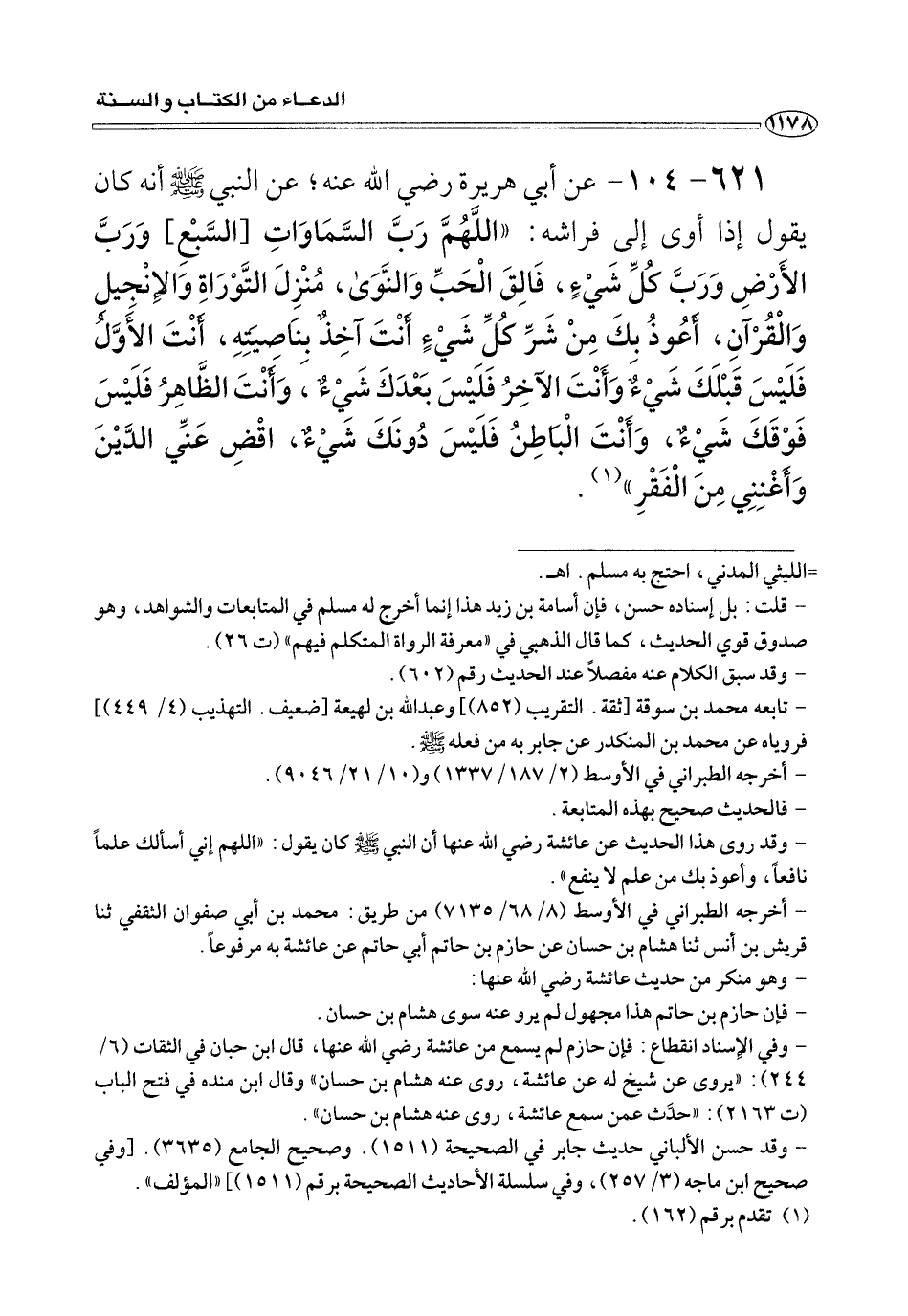 ٦٢١ - ١٠٤ - عن أَبِي هريرة رضي الله عنه؛ عن النبي صلى الله عليه وسلم أنه كَانَ يَقُولُ إِذَا أوى إلى فراشه: «اللَّهُمَّ رَبَّ السَّمَاوَاتِ [السَّبْعِ] وَرَبَّ الأَرْضِ وَرَبَّ كُلِّ شَيْءٍ، فَالِقَ الْحَبِّ وَالنَّوَى، مُنْزِلَ التَّوْرَاةِ وَالإِنْجِيل وَالْقُرْآنِ، أَعُوذُ بِكَ مِنْ شَرِّ كُلِّ شَيْءٍ أَنْتَ آخِذٌ بِنَاصِيَتِهِ، أَنْتَ الأَوَّلُ فَلَيْسَ قَبْلَكَ شَيْءٍ وَأَنْتَ الآخِرُ فَلَيْسَ بَعْدَكَ شَيْءٌ، وَأَنْتَ الظَّاهِرُ فَلَيْسَ فَوْقَكَ شَيْءٌ، وَأَنْتَ الْبَاطِنُ فَلَيْسَ دُونَكَ شَيْءٌ، اقْضِ عَنِّي الدَّيْنَ وَأَغْنِنِي مِنَ الْفَقْرِ» (¬١) .