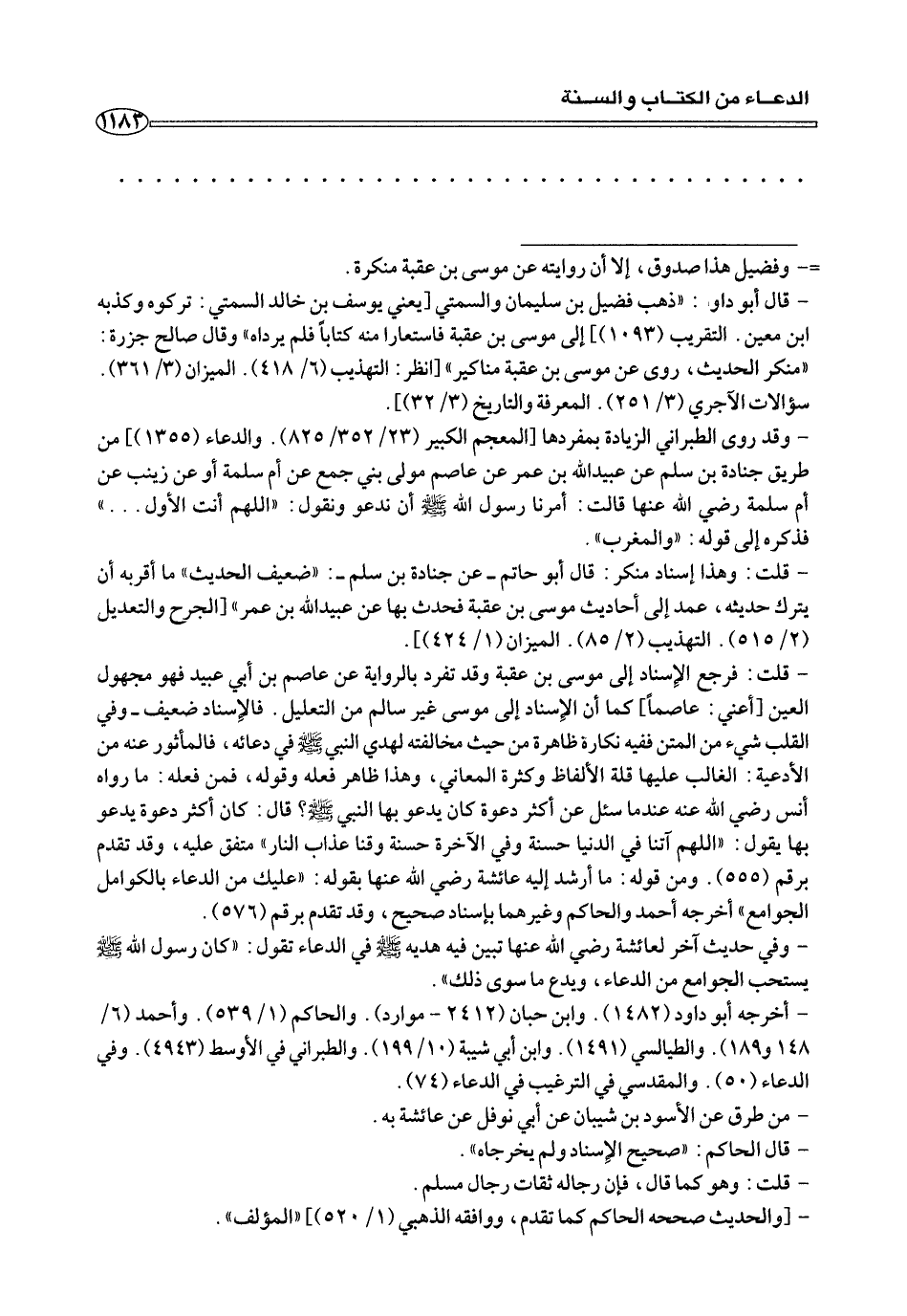 - قلت: فرجع الإسناد إلى موسى بن عقبة وقد تفرد بالرواية عن عاصم بن أبي عبيد فهو مجهول العين [أعني: عاصما] كما أن الإسناد إلى موسى غير سالم من التعليل. فالإسناد ضعيف- وفي القلب شيء من المتن ففيه نكارة ظاهرة من حيث مخالفته لهدي النبي صلى الله عليه وسلم في دعائه، فالمأثور عنه من الأدعية: الغالب عليها قلة الألفاظ وكثرة المعاني، وهذا ظاهر فعله وقوله، فمن فعله: ما رواه أنس رضى الله عنه عندما سئل عن أكثر دعوة كان يدعو بها النبي صلى الله عليه وسلم؟ قال: كان أكثر دعوة يدعو بها يقول: «اللهم آتنا في الدنيا حسنة وفي الآخرة حسنة وقنا عذاب النار» متفق عليه، وقد تقدم برقم (٥٥٥). ومن قوله: ما أرشد إليه عائشة رضي الله عنها بقوله: «عليك من الدعاء بالكوامل الجوامع» أخرجه أحمد والحاكم وغيرهما بإسناد صحيح، وقد تقدم برقم (٥٧٦).