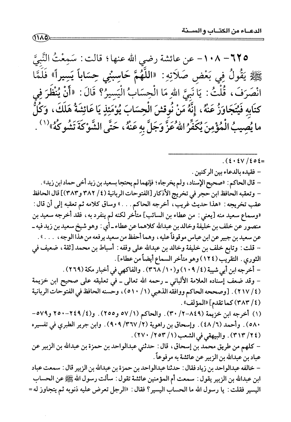 ٦٢٥ - ١٠٨ - عن عائشة رضي الله عنها، قَالَت: سمعت النبي صلى الله عليه وسلم يَقُولُ في بعض صلاته: «اللَّهُمَّ حَاسِبْنِي حِسَابًا يَسِيرًا» فَلَمَّا انْصَرَفَ، قُلْتُ: يَا نَبِيَّ اللهِ مَا الْحِسَابُ الْيَسِيرُ؟ قَالَ: «أَنْ يُنْظَرَ فِي كِتَابِهِ فَيُتَجَاوَزُ عَنْهُ، إِنَّهُ مِنْ نُوِقشَ الْحِسَابَ يُوْمَئِذٍ يَا عَائِشَةُ هَلَكَ، وَكُلُّ مَا يُصِيبُ الْمُؤْمِنَ يُكَفِّرُ اللهُ عَزَّ وَجَلَّ بِهِ عَنْهُ، حَتَّى الشَّوْكَةَ تَشُوكُهُ» (¬١) .