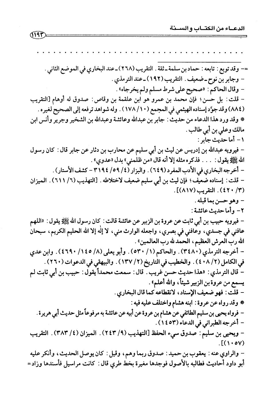 - فيرويه عبد الله بن إدريس عن ليث بن أبي سليم عن محارب بن دثار عن جابر قال: كان رسول الله صلى الله وعليه وسلم يقول: .... فذكره مثله إلا أنه قال» من ظلمني» بدل» عدوي».