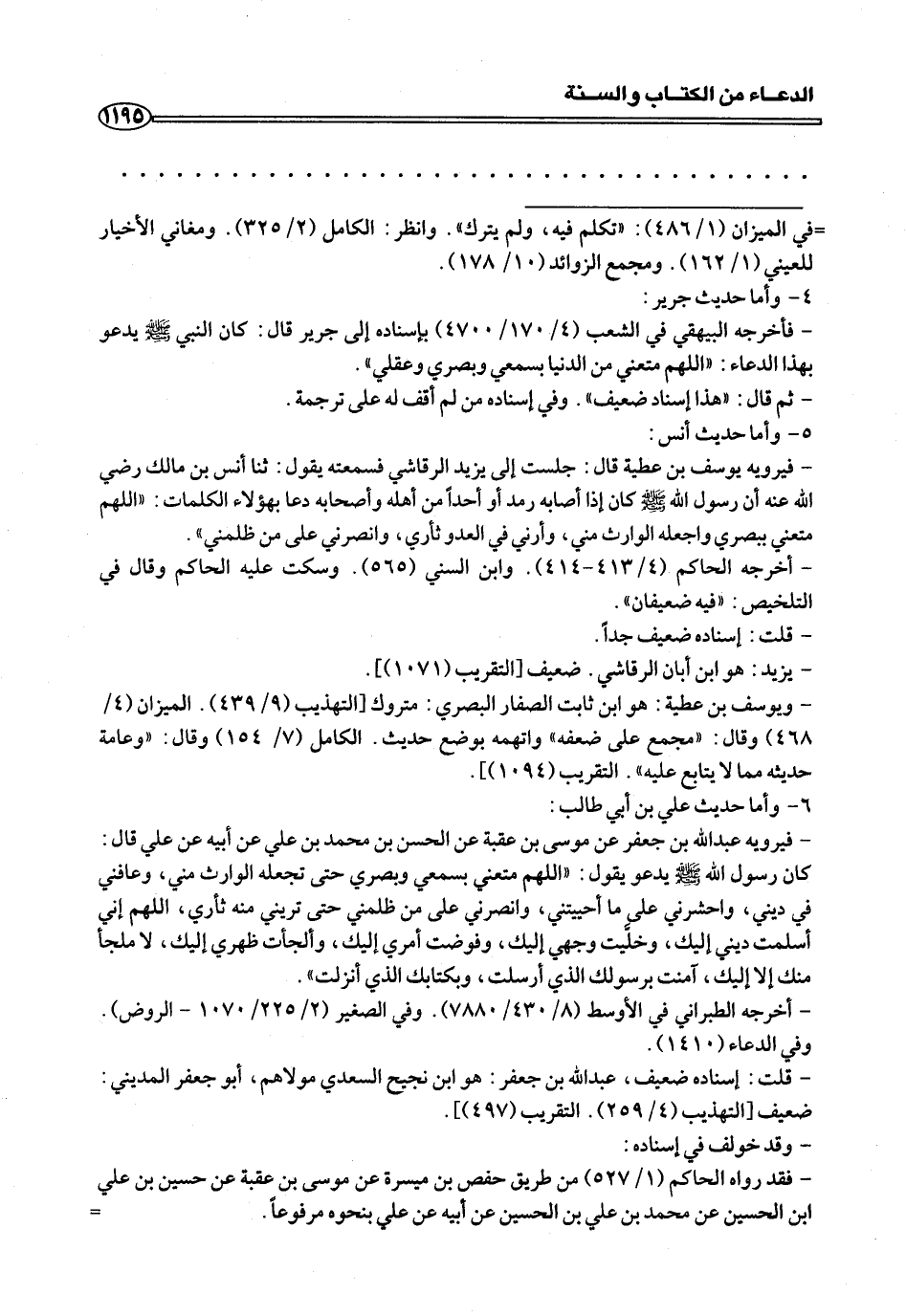 - فيرويه يوسف بن عطية قال: جلست إلى يزيد الرقاشي فسمعته يقول: ثنا أنس بن مالك رضي الله عنه أن رسول الله صلى الله عليه وسلم كان إذا أصابه رمد أو أحدًا من أهله وأصحابه دعا بهؤلاء الكلمات: «اللهم متعني ببصري واجعله الوارث مني، وأرني في العدو ثأري، وانصرني على من ظلمني».
