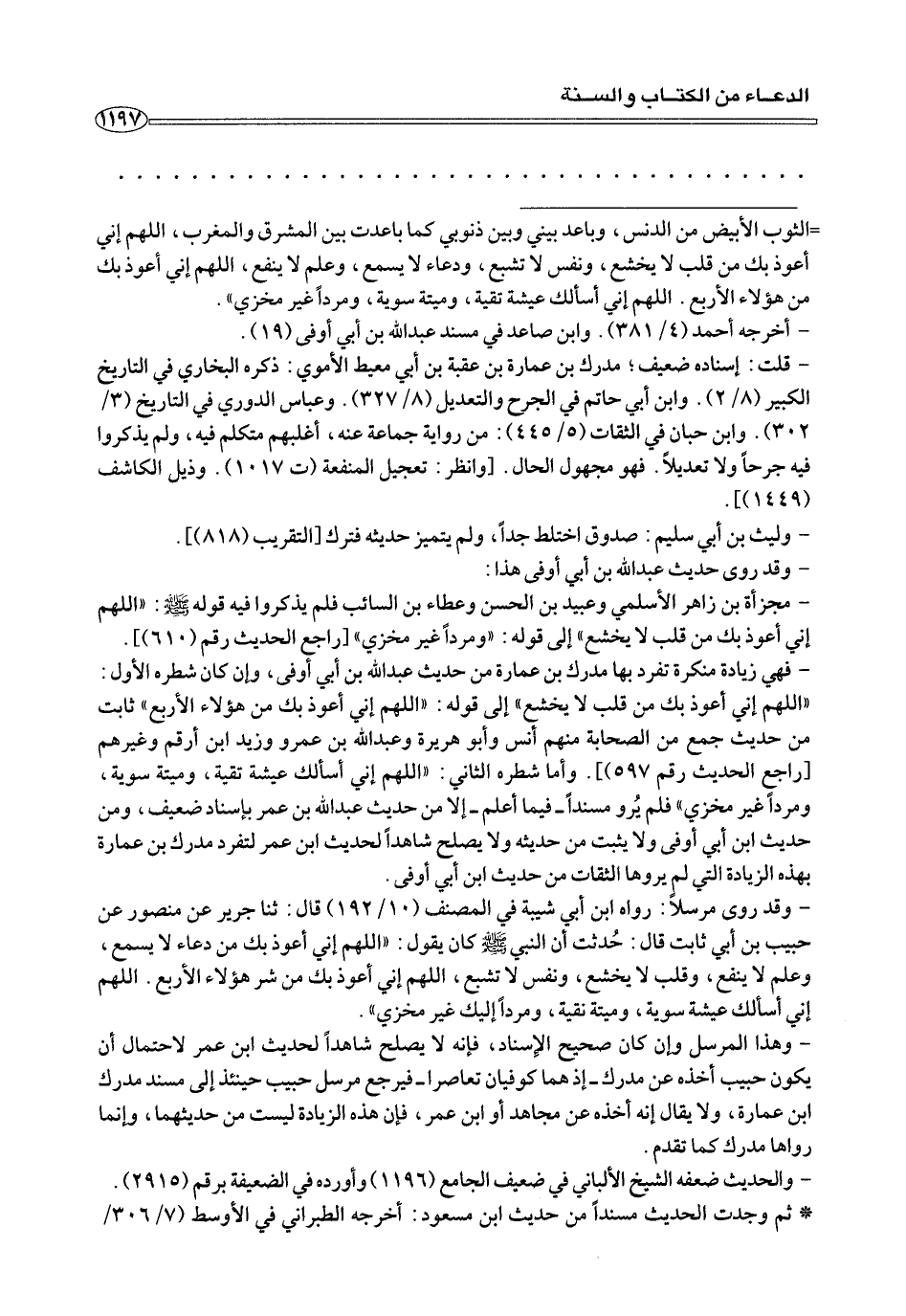 - فهي زيادة منكرة تفرد بها مدرك بن عمارة من حديث عبد الله بن أبي أوفى، وإن كان شطره الاول: «اللهم إني أعوذ بك من قلب لا يخشع» إلى قوله: «اللهم إني أعوذ بك من هؤلاء الأربع» ثابت من حديث جمع من الصحابة منهم أنس وأبو هريرة وعبد الله بن عمرو وزيد ابن أرقم وغيرهم [راجع الحديث رقم (٥٩٧)]. وأما شطره الثاني: «اللهم إني أسألك عيشة تقية، وميتة سوية، ومردًا غير مخزي» فلم يرو مسندًا- فيما أعلم- إلا من حديث عبد الله بن عمر بإسناد ضعيف، ومن حديث ابن أبي أوفى ولا يثبت من حديثه ولا يصلح شاهدًا لحديث ابن عمر لتفرد مدرك بن عمارة بهذه الزيادة التي لم يروها الثقات من حديث ابن أبي أوفى.