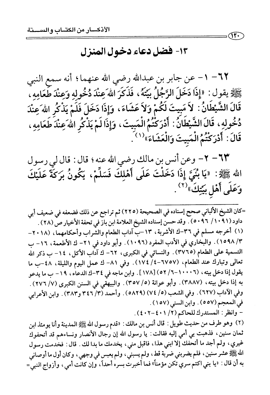 ٦٢ - ١ - عَنْ جابر بن عبد الله رضي الله عنهما؛ إِنَّهُ سمع رسول الله صلى الله عليه وسلم يقول: «إِذَا دَخَلَ الرَّجُلُ بَيْتَهُ، فَذَكَرَ اللهَ عِنْدَ دُخُولِهِ وَعِنْدَ طَعَامِهِ، قَالَ الشَّيْطَانُ: لَا مَبِيتَ لَكُمْ وَلَا عَشَاءَ، وَإِذَا دَخَلَ فَلَمْ يَذْكُرِ اللهَ عِنْدَ دُخُولِه، قَالَ الشَّيْطَانُ: أَدْرَكْتُمُ الْمَبِيتَ، وَإِذَا لَمْ يَذْكُرِ اللهَ عِنْدَ طَعَامِهِ، قَالَ: أَدْرَكْتُمُ الْمَبِيتَ وَالْعَشَاءَ» (¬١).