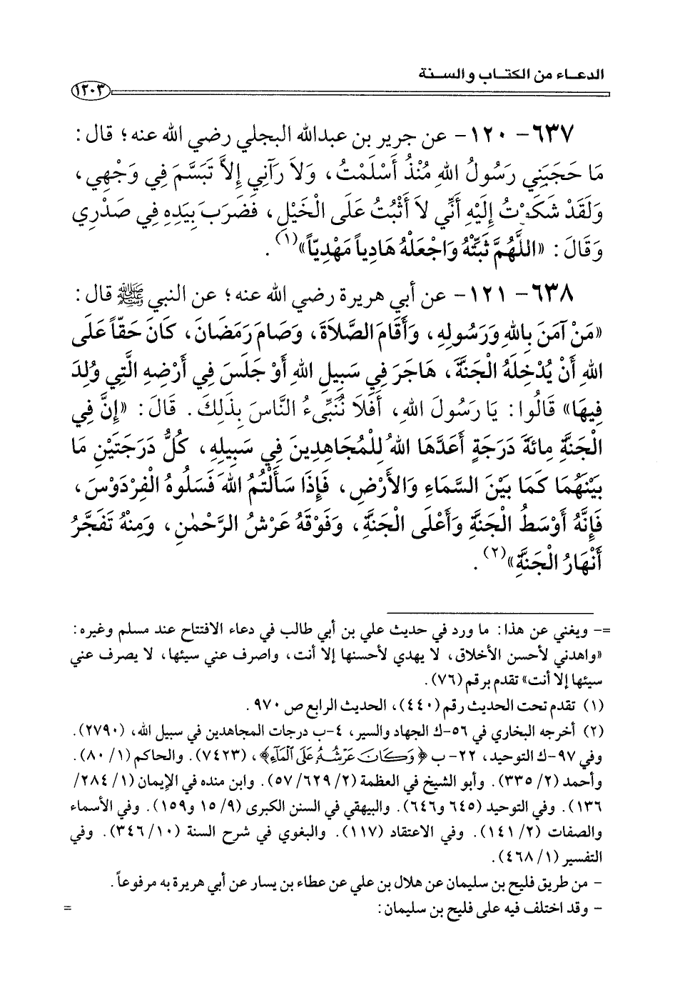 ٦٣٧ - ١٢٠ - عن جرير بن عبد الله البجلي رضي الله عنه؛ قَالَ: مَا حجبني رسول الله منذ أسلمت، وَلَا رآني إلا تبسم في وجهي، ولقد شكوت إِلَيْهِ أني لَا أثبت عَلَى الخيل، فضرب بيده في صدري وقَالَ: «اللَّهُمَّ ثبته واجعله هاديًا مهديًا» (¬١) .