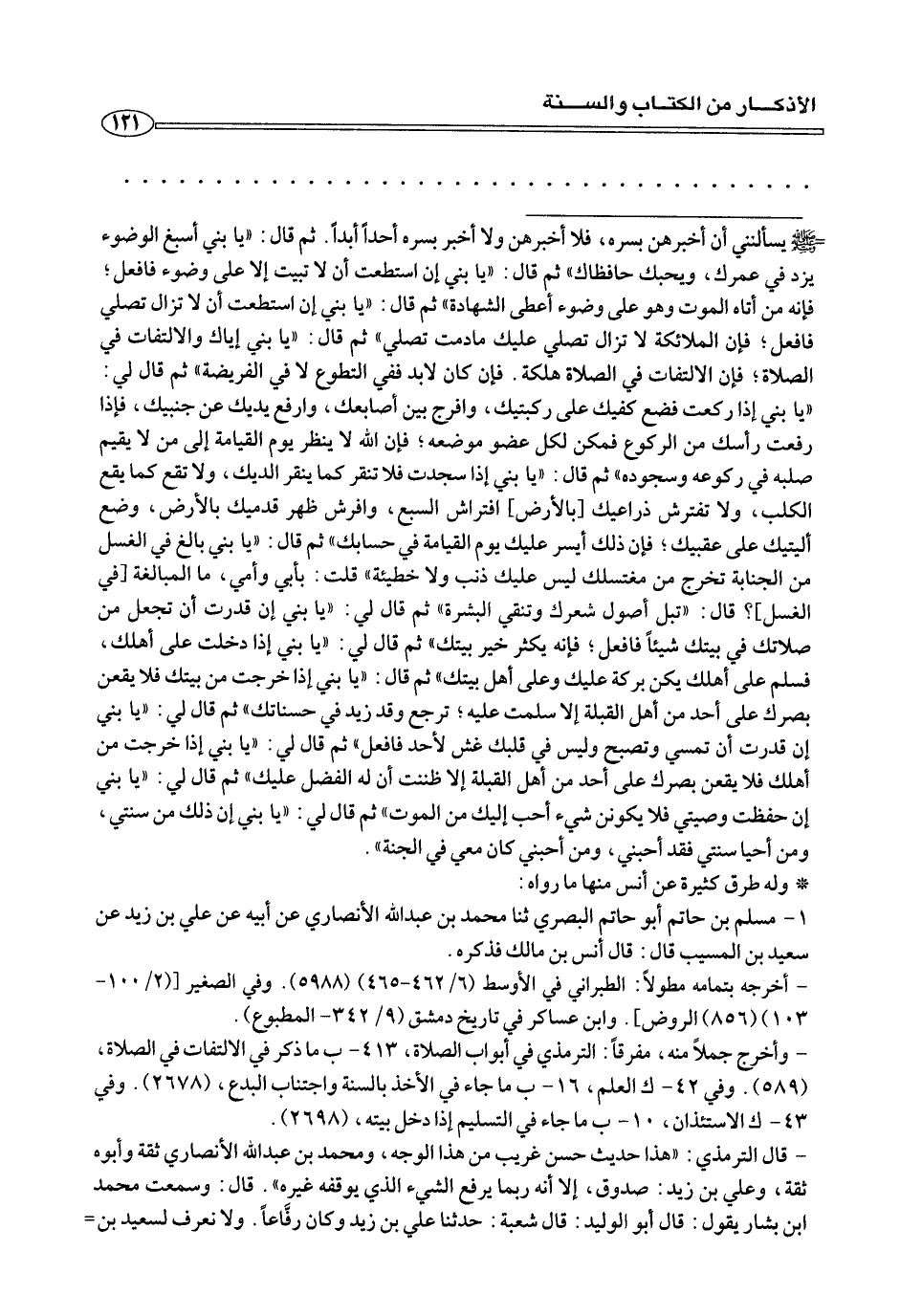 =صلى الله عليه وسلم يسألنني أن أخبرهن بسره، فلا أخبرهن ولا أخبر بسره أحدا أبدا. ثم قال: «يا بني أسبغ الوضوء يزد في عمرك، ويحبك حافظاك «ثم قال: «يا بني إن استطعت أن لا تبيت إلا على وضوء فأفعل؛ فإنه من أتاه الموت وهو على وضوء أعطى الشهادة «ثم قال: «يا بني إن استطعت أن لا تزال تصلي فأفعل؛ فإن الملائكة لا تزال تصلي عليك مادمت تصلي «ثم قال: «يا بني إياك والالتفات في الصلاة؛ فإن الالتفات في الصلاة هلكة. فإن كان لابد ففي التطوع لا في الفريضة «ثم قال لي: «يا بني إذا ركعت فضع كفيك على ركبتيك، وأفرج بين أصابعك، وأرفع يديك عن جنبيك، فإذا رفعت رأسك من الركوع فمكن لكل عضو موضعه؛ فإن الله لا ينظر يوم القيامة إلى من لا يقيم صلبه في ركوعه وسجوده «ثم قال: «يا بني إذا سجدت فلا تنقر كما ينقر الديك، ولا تقع كما يقع الكلب، ولا تفترش ذراعيك] الأرض] افتراش السبع، وافرش ظهر قدميك بالأرض، وضع أليتيك على عقبيك؛ فإن ذلك أيسر عليك يوم القيامة في حسابك «ثم قال: «يا بني بالغ في الغسل من الجنابة تخرج من مغتسلك ليس عليك ذنب ولاخطيئة «قلت: بأبي وأمي، ما المبالغة] في الغسل]؟ قال: «تبل أصول شعرك وتنقي البشرة «ثم قال لي: «يا بني إن قدرت أن تجعل من صلاتك في بيتك شيئا فأفعل؛ فإنه يكثر خير بيتك «ثم قال لي: «يا بني إذا دخلت على أهلك، فسلم على أهلك يكن بركة عليك وعلى أهل بيتك «ثم قال: «يا بني إذا خرجت من بيتك فلا يقعن بصرك على أحد من أهل القبلة إلا سلمت عليه؛ ترجع وقد زيد في حسناتك «ثم قال لي: «يا بني إن قدرت أن تمسي وتصبح وليس في قلبك غش لأحد فأفعل «ثم قال لي: «يا بني إذا خرجت من أهلك فلا يقعن بصرك على أحد من أهل القبلة إلا ظننت أن له الفضل عليك «ثم قال لي: «يا بني إن حفظت وصيتي فلا يكونن شيء أحب إليك من الموت «ثم قال لي: «يا بني إن ذلك من سنتي، ومن أحيا سنتي فقد أحبني، ومن أحبني كان معي في الجنة».