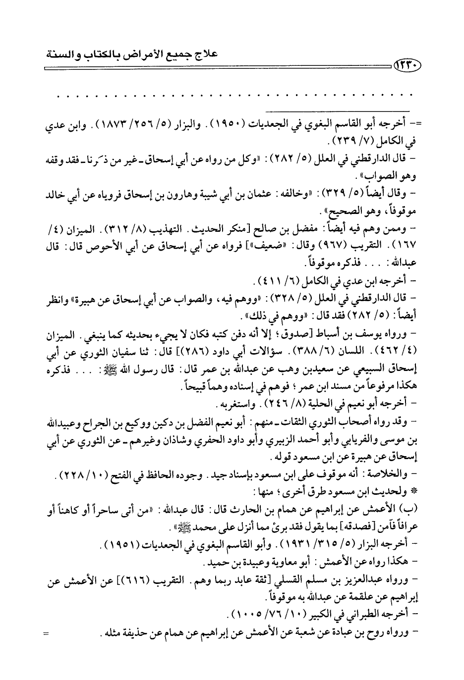(ب) الأعمش عن إبراهيم عن همام بن الحارث قال: قال عبد الله: «من أتى ساحرًا أو كاهنًا أو عرافًا فآمن [فصدقه] بما يقول فقد برئ مما أنزل على محمدٍ- صلى الله عليه وسلم-».