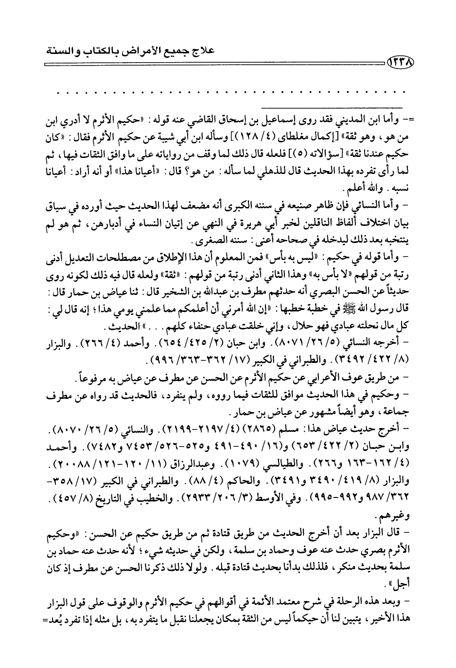 - وأما قوله في حكيم: «ليس به بأس» فمن المعلوم أن هذا الإطلاق من مصطلحات التعديل أدنى رتبةٍ من قولهم «لا بأس به» وهذا الثاني أدنى رتبةً من قولهم: «ثقة» ولعله قال فِيهِ ذلك بكونه روى حديثًا عن الحسن البصري أنه حدثهم مطرف بن عبد الله بن الشخير قال: ثنا عياض بن حمار قال: قال رسول الله- صلى الله عليه وسلم- في خطبةٍ خطبها: «إن الله أمرني أن أعلمكم مما علمني يومي هذا؛ إنه قال لي: كل مالٍ نحلته عبادي فهو حلال، وإني خلقت عبادي حنفاء كلهم ... » الحديث.