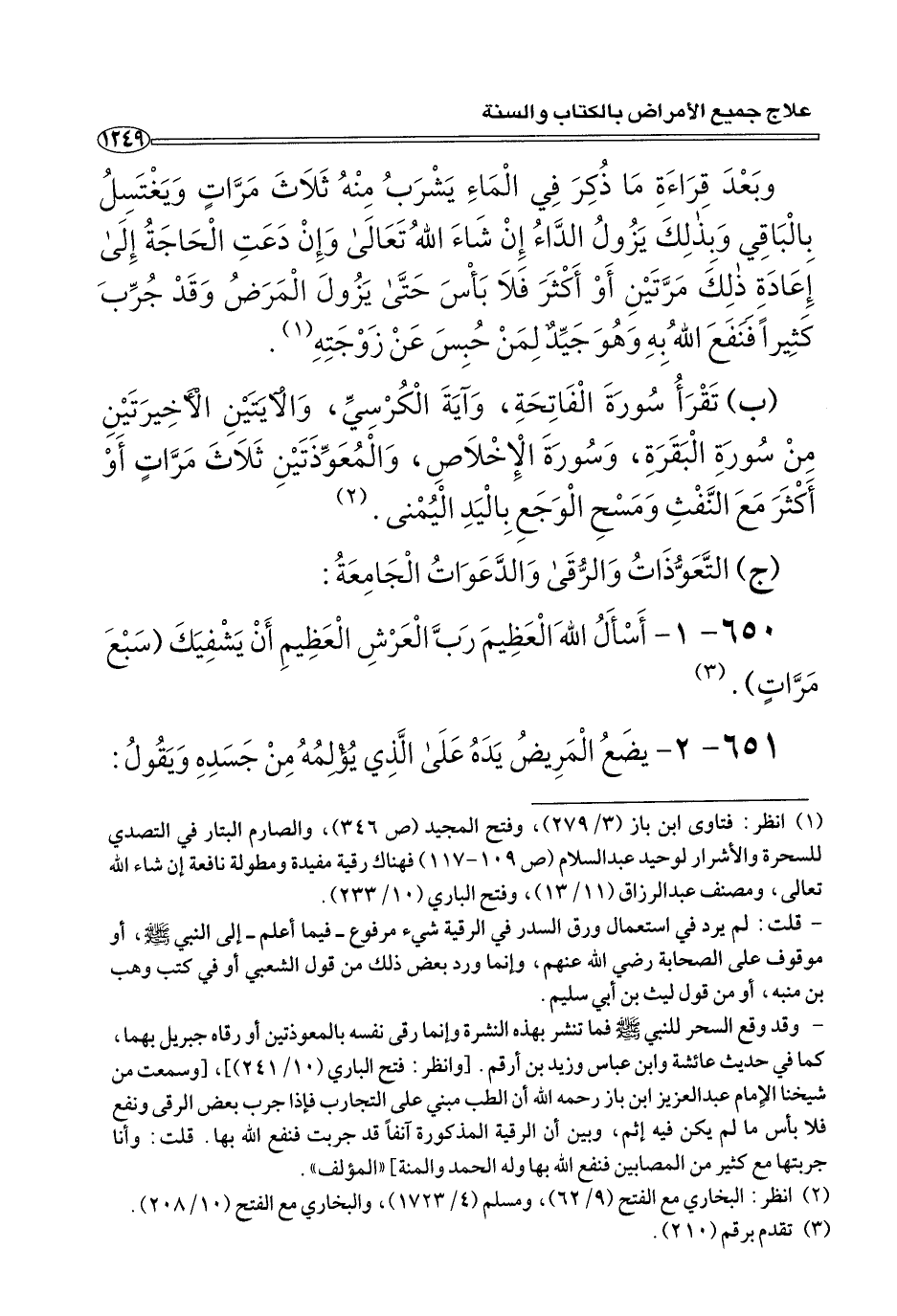 (¬١) انظر: فتاوى ابن باز (٣/ ٢٧٩)، وفتح المجيد (ص ٣٤٦)، والصارم البتار في التصدي للسحرة والأشرار لوحيد عبد السلام (ص ١٠٩ - ١١٧) فهناك رقية مفيدة ومطولة نافعة إن شاء الله تعالى، ومنصف عبد الرازق (١١/ ١٣)، وفتح الباري (١٠/ ٢٣٣).