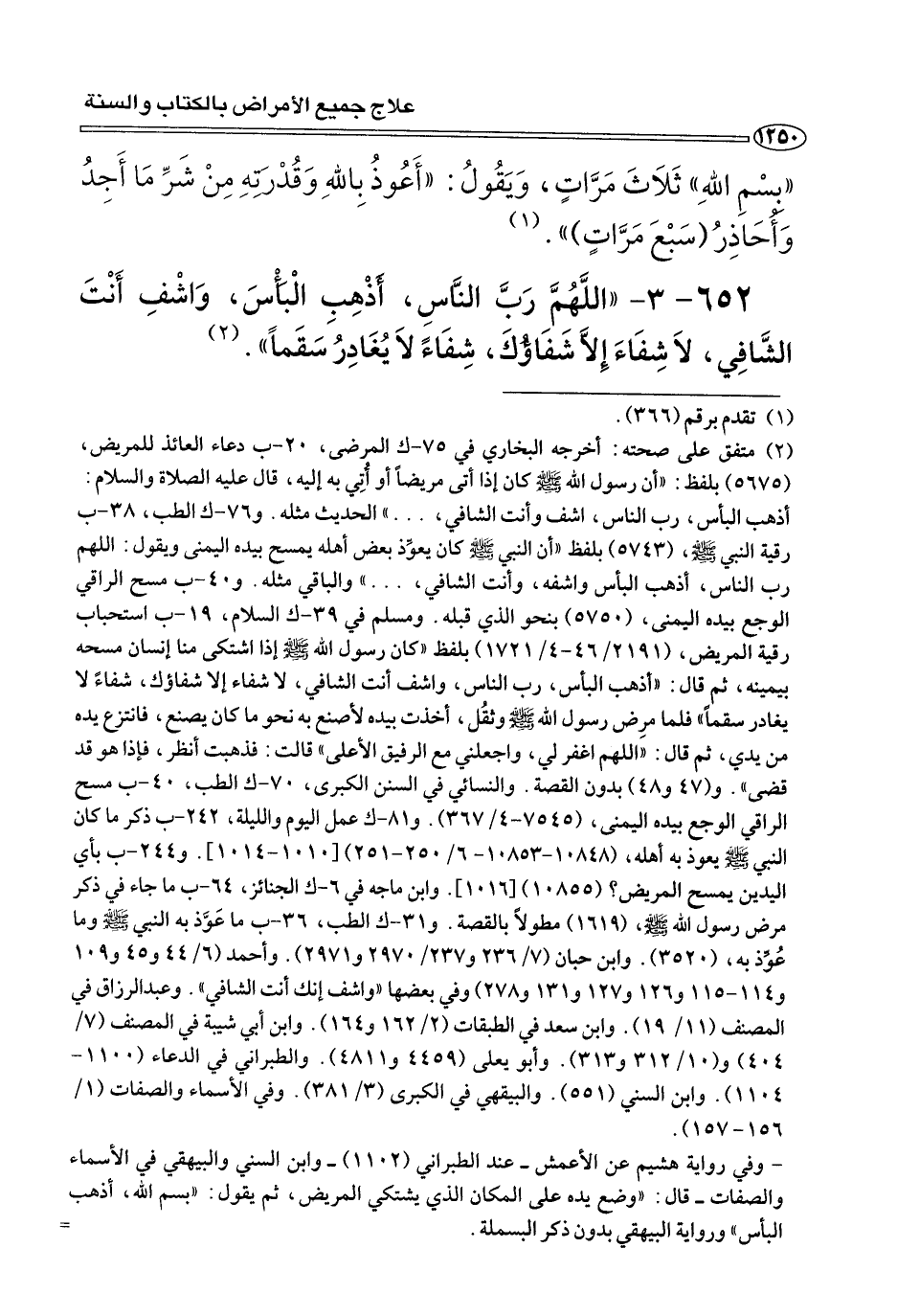 (¬٢) متفق على صحته: أخرجه البخاري في ٧٥ - ك المرضى، ٢٠ - ب دعاء العائذ للمريض، (٥٦٧٥) بلفظ: «أن رسول الله صلى الله عليه وسلم كان إِذَا أتى مريضًا أو اُتِي به إليه، قال عليه الصلاة والسلام: أذهب البأس، رب الناس وأنت الشافي، ... » الحديث مثله. و ٧٦ - ك الطب، ٣٨ - ب رقية النبي صلى الله عليه وسلم، (٥٧٤٣) بلفظ «أن النبي صلى الله عليه وسلم كان يعوِّذ بعض أهله يمسح بيده اليمنى ويقول: اللهم رب الناس، أذهب البأس واشفه، وأنت الشافي، ... » والباقي مثله. و ٤٠ - ب مسح الراقى الوجع بيده اليمنى، (٥٧٥٠) بنحو الذي قبله. ومسلم في ٣٩ - ك السلام، ١٩ - ب استحباب رقية المريض، (٢١٩١/ ٤٦ - ٤/ ١٧٢١) بلفظ «كان رسول الله صلى الله عليه وسلم إِذَا اشتكى منا إنسان مسحه بيمينه، ثم قال: «أذهب البأس، رب الناس، واشف وأنت الشافي، لا شفاء إلا شفاؤك، شفاءً لا يغادر سقمًا» فلما مرِض رسول الله صلى الله عليه وسلم وثقُل، أخذت بيده لأصنع به نحو ما كان يصنع، فانتزع يده من يدي، ثم قال: «اللهم اغفر لي، وجعلني مع الرفيق الأعلى» قالت: فذهبت أنظر، فإذا هو قد قضى». و (٤٧ و ٤٨) بدون القصة. والنسائي في السنن الكبرى، ٧٠ - ك الطب، ٤٠ - ب مسح الراقي الوجع بيده اليمنى، (٧٥٤٥ - ٤/ ٣٦٧). و ٨١ - ك عمل اليوم والليلة، ٢٤٢ - ب ذكر ما كان النبي صلى الله عليه وسلم يعوذ به أهله، (١٠٨٤٨ - ١٠٨٥٣ - ٦/ ٢٥٠ - ٢٥١) [١٠١٠ - ١٠١٤]. و ٢٤٤ - ب بأي اليدين يمسح المريض؟ (١٠٨٥٥) [١٠١٦]. وابن ماجه في ٦ - ك الجنائز، ٦٤ - ب ما جاء في ذكر مرض رسول الله صلى الله عليه وسلم، (١٦١٩) مطولًا بالقصة. و ٣١ - ك الطب، ٣٦ - ب ما عَوَّذ به النبي صلى الله عليه وسلم، وما عُوِّذ به، (٣٥٢٠). وابن حبان (٧/ ٢٣٦ و ٢٣٧/ ٢٩٧٠ و ٢٩٧١). وأحمد (٦/ ٤٤ و ٤٥ و ١٠٩ و ١١٤ - ١١٥ و ١٢٦ و ١٢٧ و ١٣١ و ٢٧٨) وفي بعضها «واشف إنك أنت الشافي». وعبد الرازق في المصنف (١١/ ١٩). وابن سعد في الطبقات (٢/ ١٦٢ و ١٦٤). وابن أبي شيبة في المصنف (٧/ ٤٠٤) و (١٠/ ٣١٢ و ٣١٣). وأبو يعلي (٤٤٥٩ و ٤٨١١). والطبراني في الدعاء (١١٠٠ - ١١٠٤). وابن السني (٥٥١). والبيهقي في الكبرى (٣/ ٣٨١). وفي الأسماء والصفات (١/ ١٥٦ - ١٥٧).