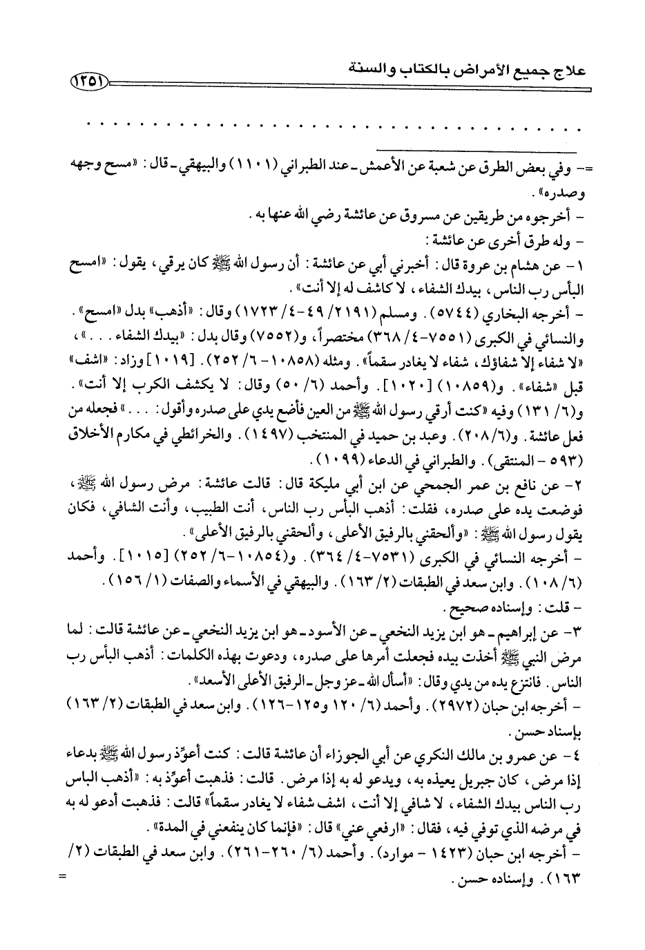 ١ - عن هشام بن عروة قال: أخبرني أبي عن عائشة: أن رسول الله صلى الله عليه وسلم كان يقول: «امسح البأس رب الناس، بيدك الشفاء، لا كاشف له إلا أنت».