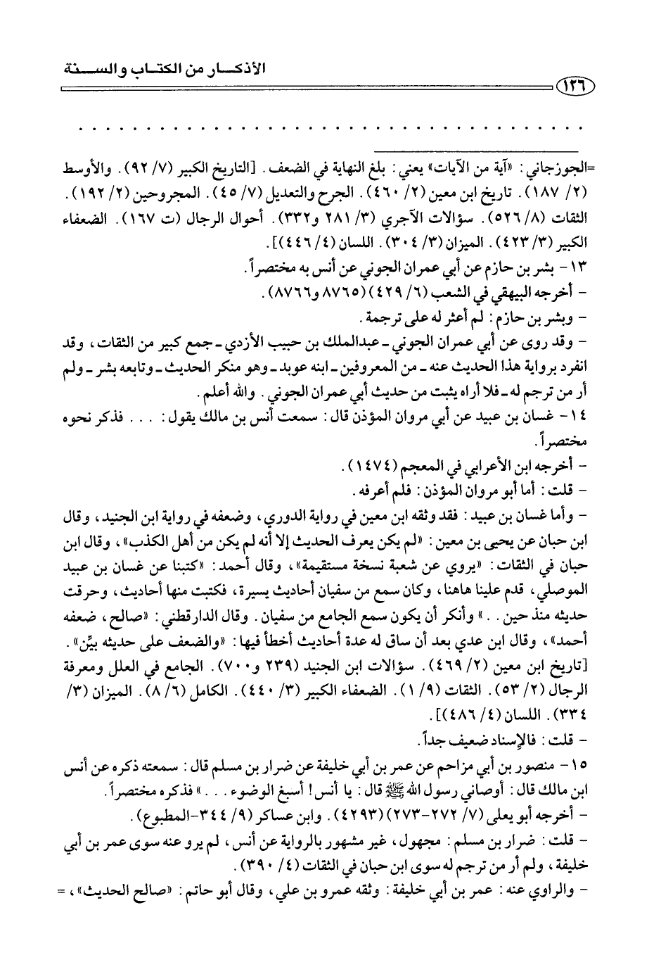 =الجوزجاني: «آية من الآيات «يعني: بلغ النهاية في الضعف. [التاريخ الكبير (٧/ ٩٢). والأوسط (٢/ ١٨٧). تاريخ ابن معين (٢/ ٤٦٠). الجرح والتعديل (٧/ ٤٥). المجروحين (٢/ ١٩٢). الثقات (٨/ ٥٢٦). سؤالات الآجري (٣/ ٢٨١ و ٣٣٢). أحوال الرجال (ت ١٦٧). الضعفاء الكبير (٣/ ٤٢٣). الميزان (٣/ ٣٠٤). اللسان (٤/ ٤٤٦)].